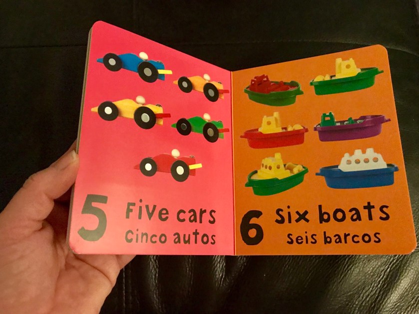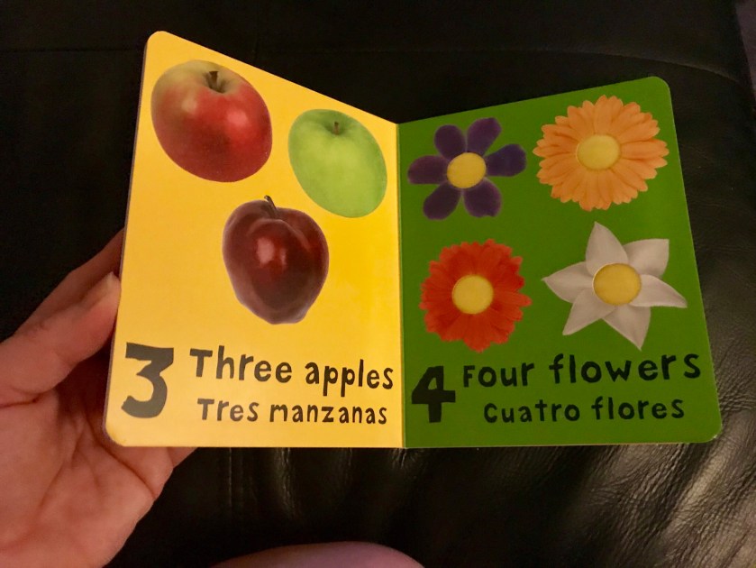 A few other thoughts I had about the book included why there was no pronunciation key for the Spanish alphabet. For example the letters rr when together in Spanish involve a tongue roll, and are not said as say an extra long or emphasized r. The point could be made that the book is mainly for bilingual individuals, yet I could see someone who knows some Spanish or maybe none at all trying to learn alongside their baby. Pronunciation is important, even for our youngest future Spanish speakers. In terms of the actual book, I wish it laid flat, as in my experience lay flat books are more sturdy, and I can see this book being a favorite and needing to be strong to do so.