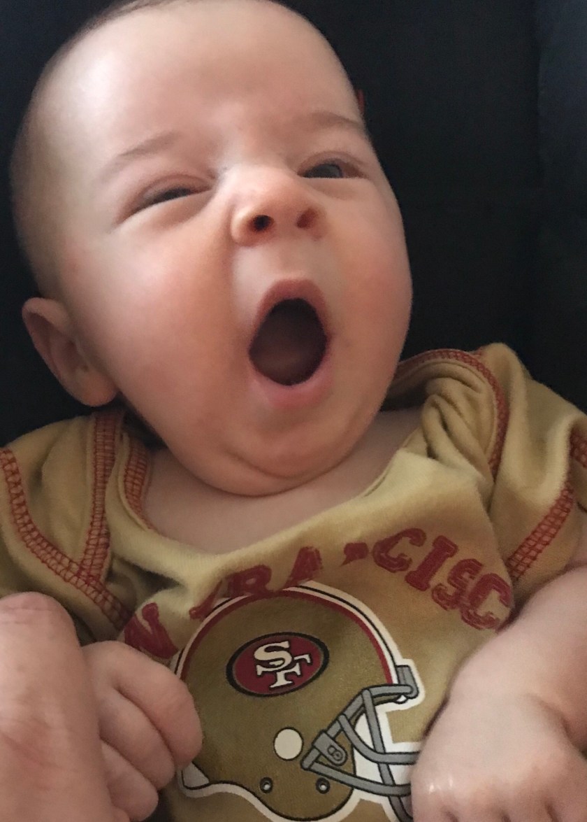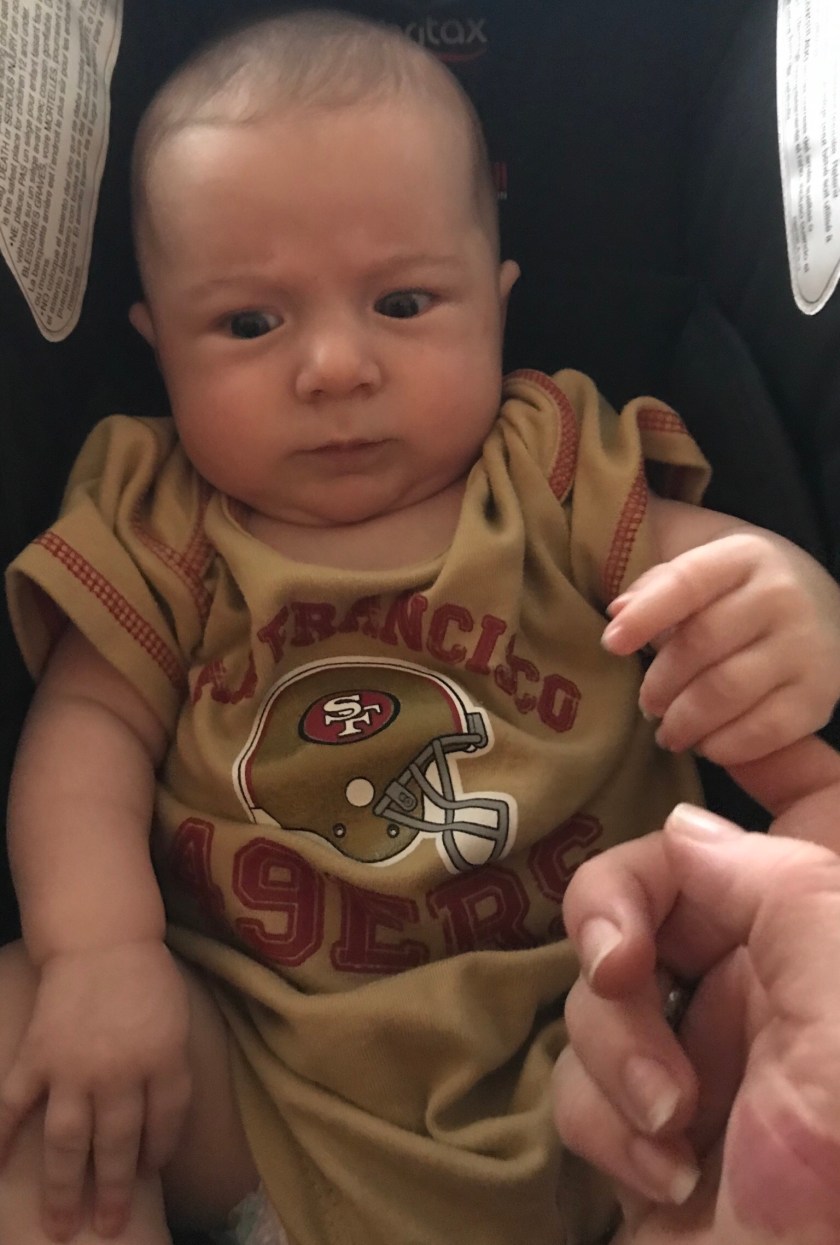The outfits from his Godparents that I was originally going to build the shoot around feature our football team, The San Francisco 49ers. He loves gripping things including my hair, which I try not to encourage, and my finger as he does here, which makes me smile every time.