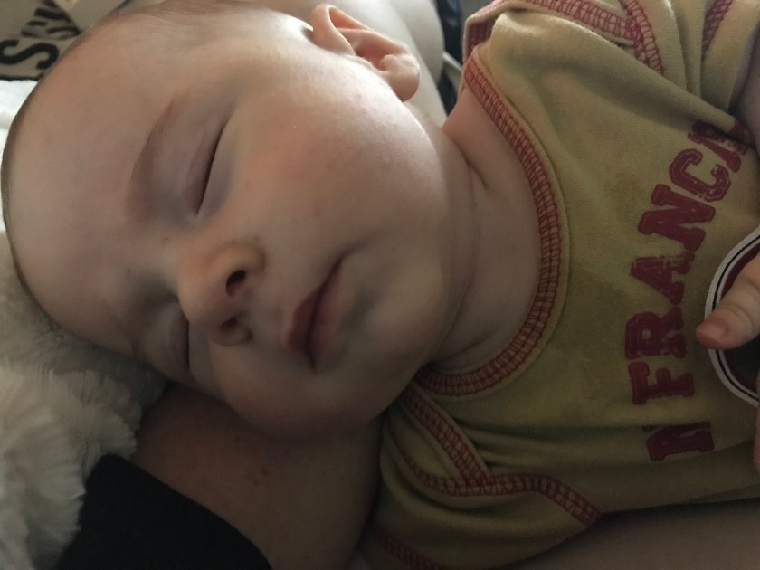 He was also hungry. It’s not unusual for him to be tired and hungry both, so I breastfed him to help with the hunger and to possibly allow him to sleep without having a tired crying jag which happens when he’s overtired. It worked so well that he fell asleep in my arms and with the fleece blanket I’d wrapped around us as a partial pillow.