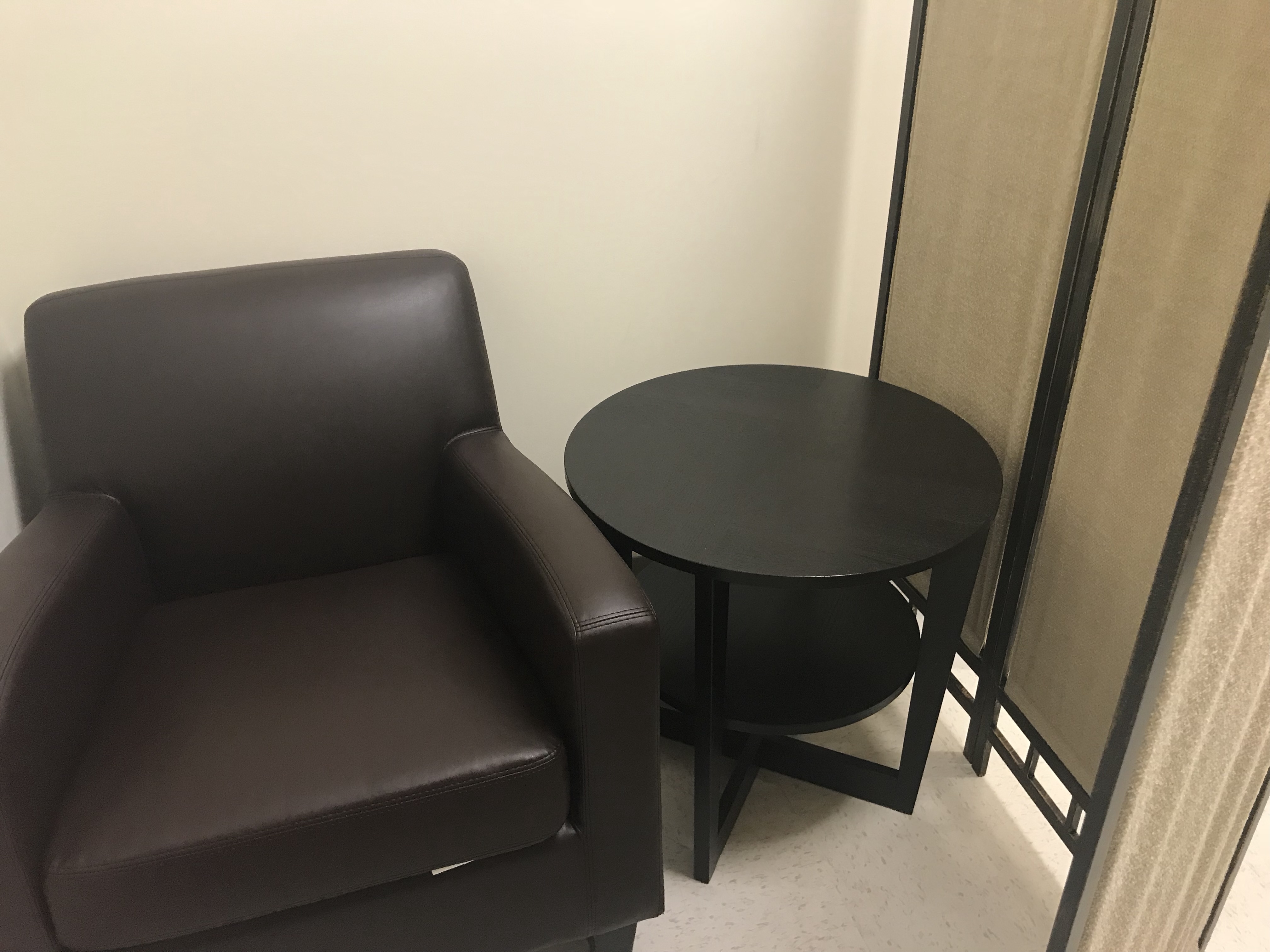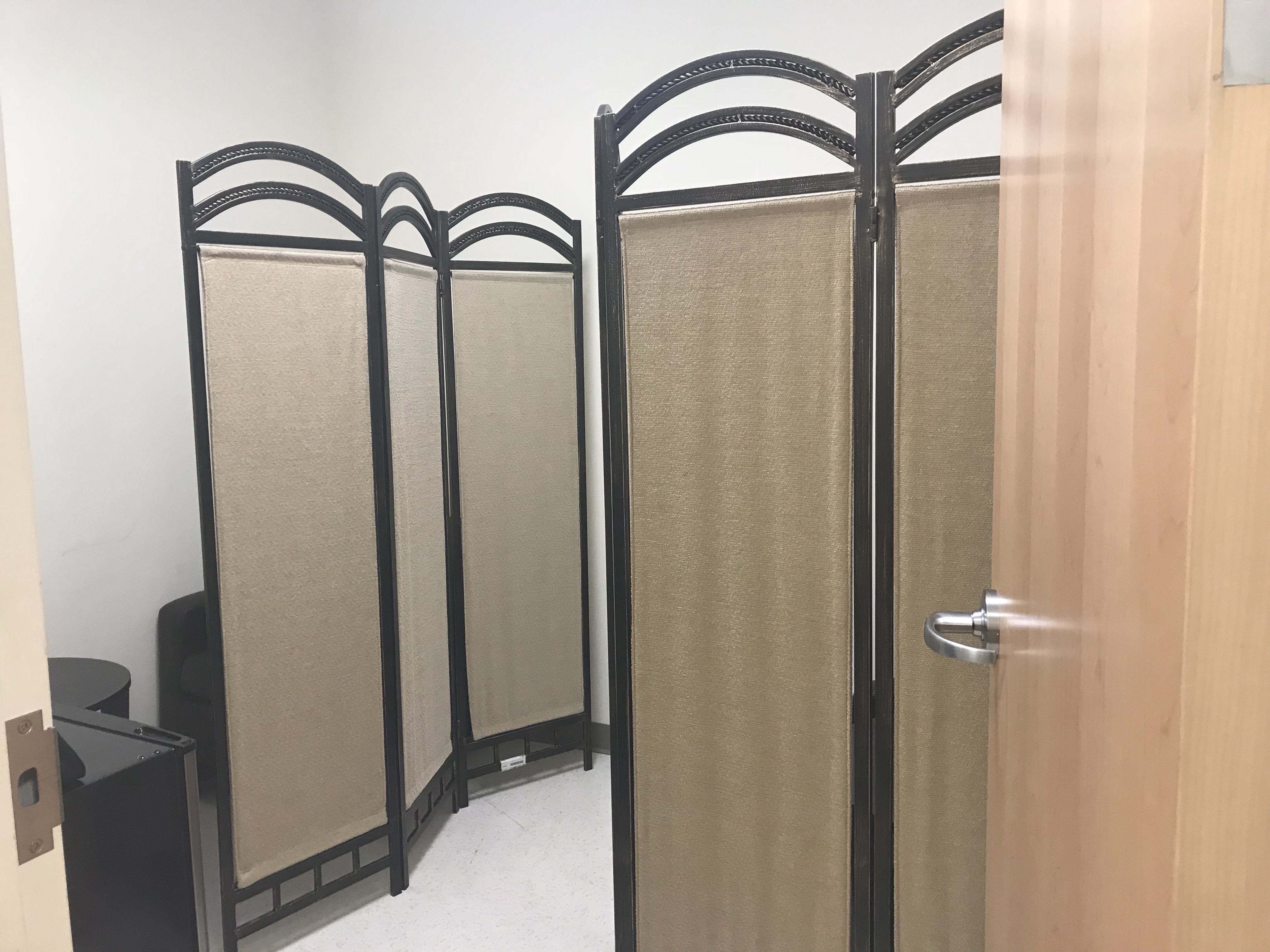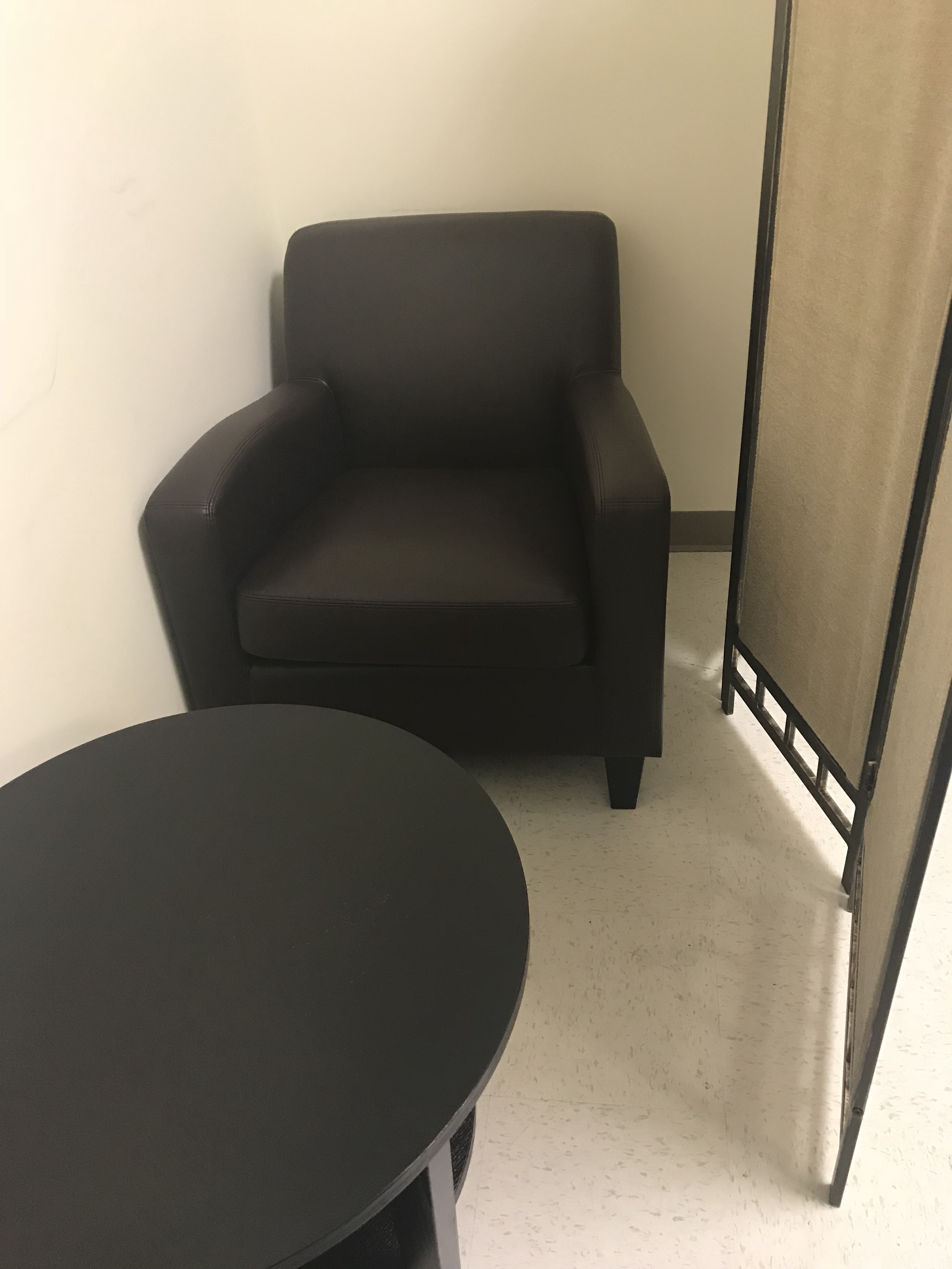 Of course wearing a dress, as both of the three lactating moms at our company do at least part of the time, means removing or rearranging clothing in a different way then we would with a blouse, shirt or sweater. For that reason I’m especially glad the Mother’s Room has also undergone a makeover as of today with new dividers, chairs and tables making it into two stations.
