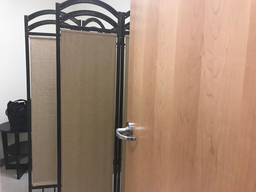 Since I pump a few times at work, I tried out both stations. I much prefer the one furthest from the door as it faces a direction I’m used to in that room. I took a photo from inside it to show how the dividers overlap so the person at the station cannot be seen.