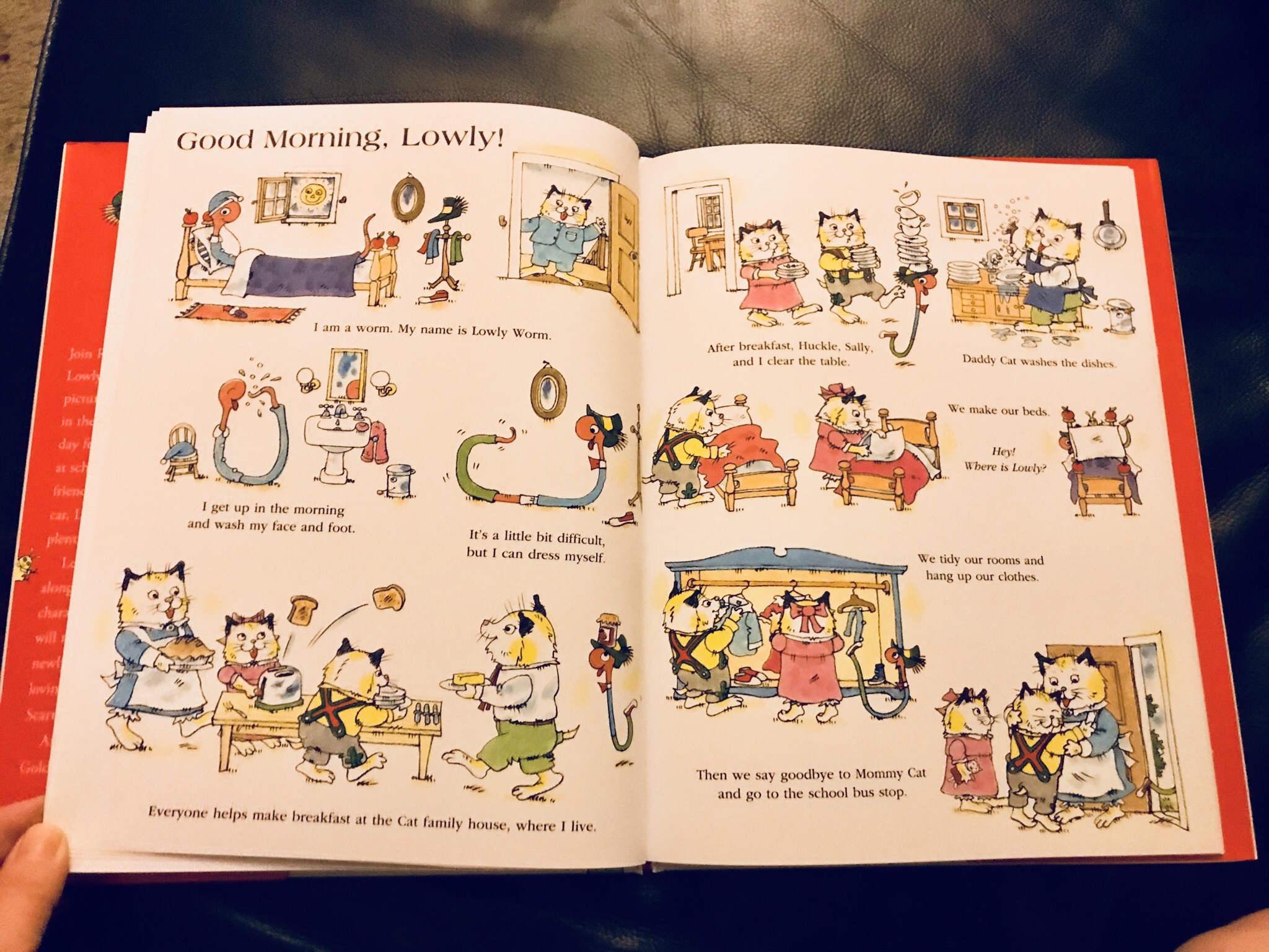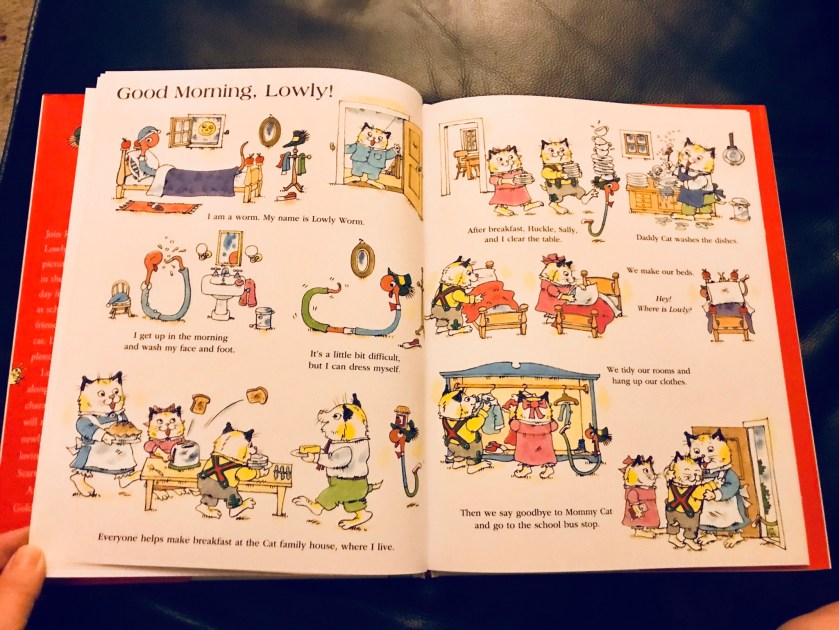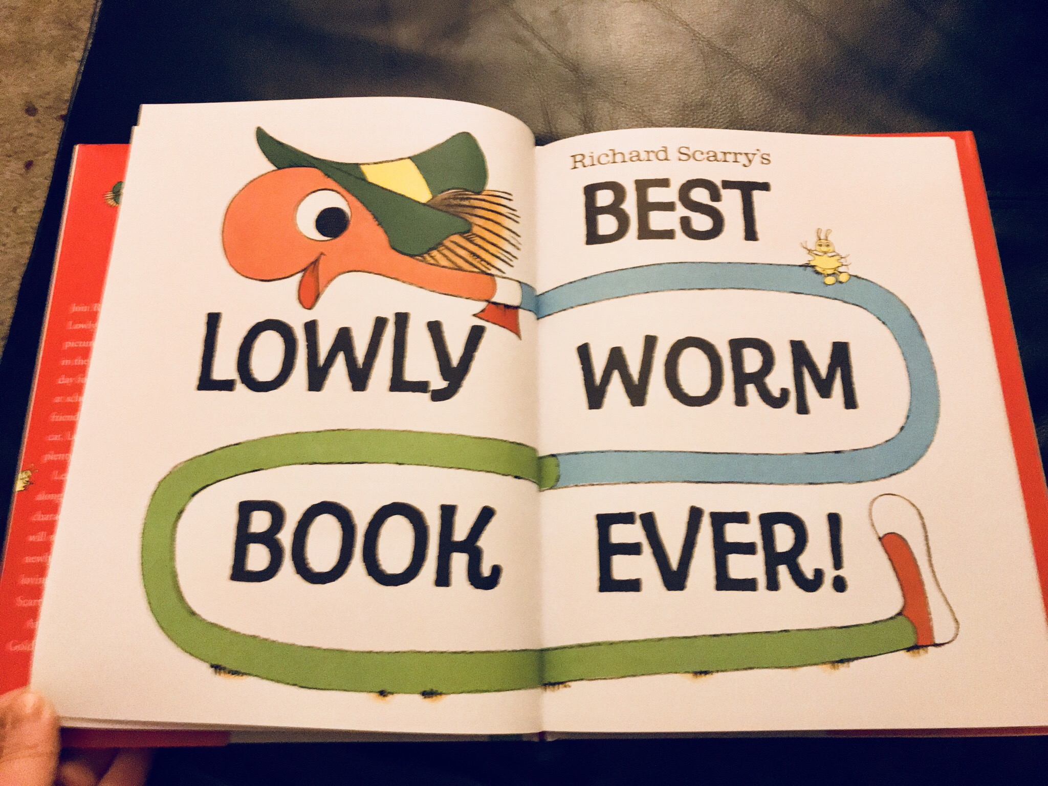 I had no idea who Lowly Worm was before I picked up the book. Candy had written William a long personal message about how he was her favorite character from Scarry and how she couldn’t wait to read to William about him. I had hoped the book might talk a bit about why they called him Lowly. The back cover did not offer any thoughts on this, though it did mention the worm having a busy day, which definitely turned out to be true.