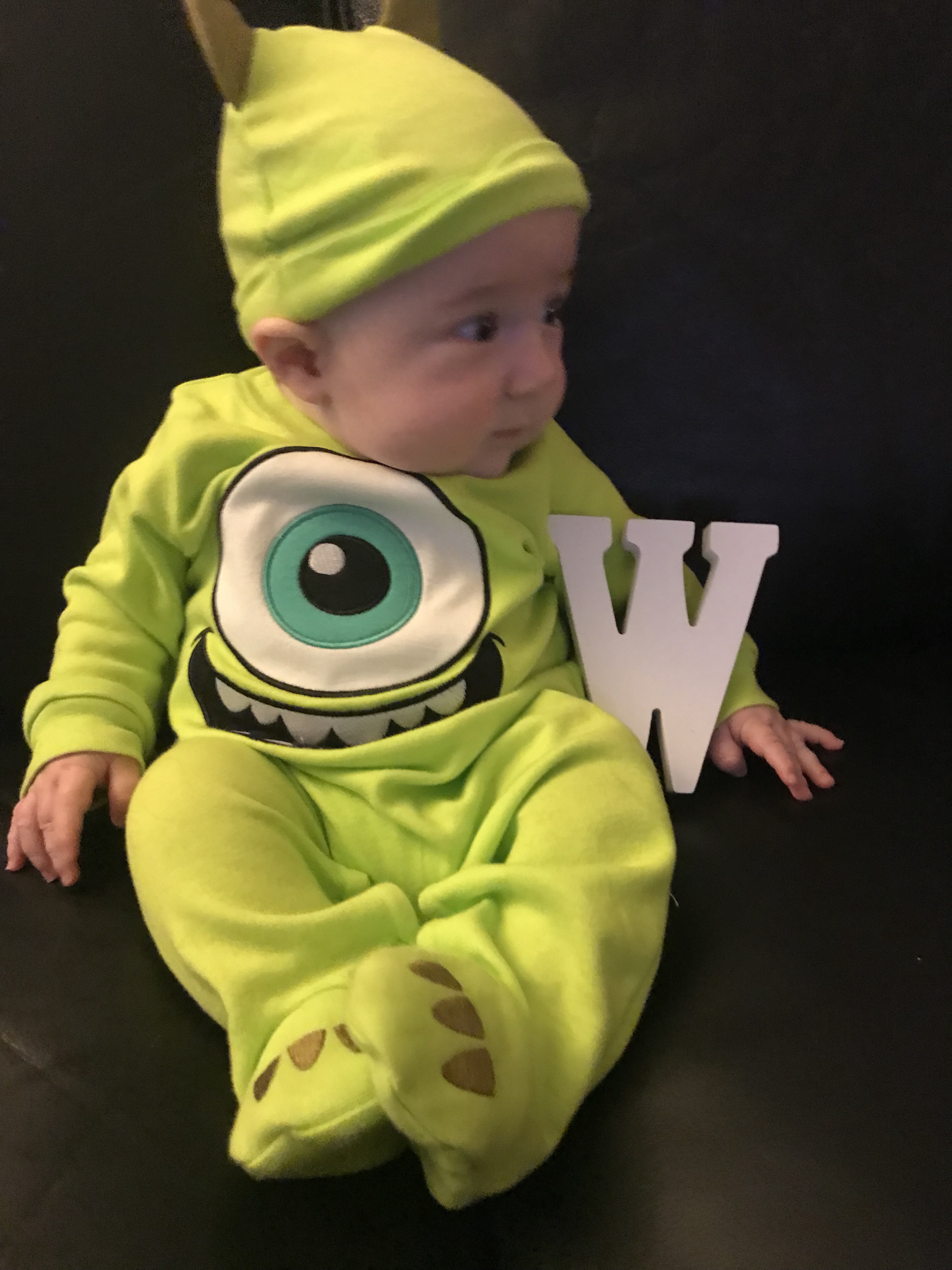 The theme for William’s Four Month Photo Shoot was animated characters. The first outfit I used for him was that of Mike Wazowski of Monsters, Inc. Matt and I found this adorable costume / sleeper just a few days before his shoot, so when I decided to use it for his shoot, it shaped the theme. At first William didn’t want to even look at the camera at all.