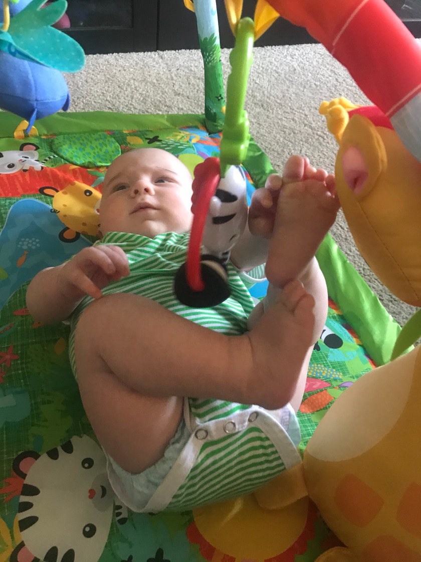 It’s so great to see William changing and growing. One amazing thing to us is watching how he learns more about himself and his environment. Recently he discovered that he can touch his toes with little effort. He first started doing so on the activity mat, bringing up his legs and gleefully touching his moving toes.