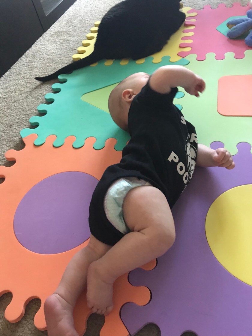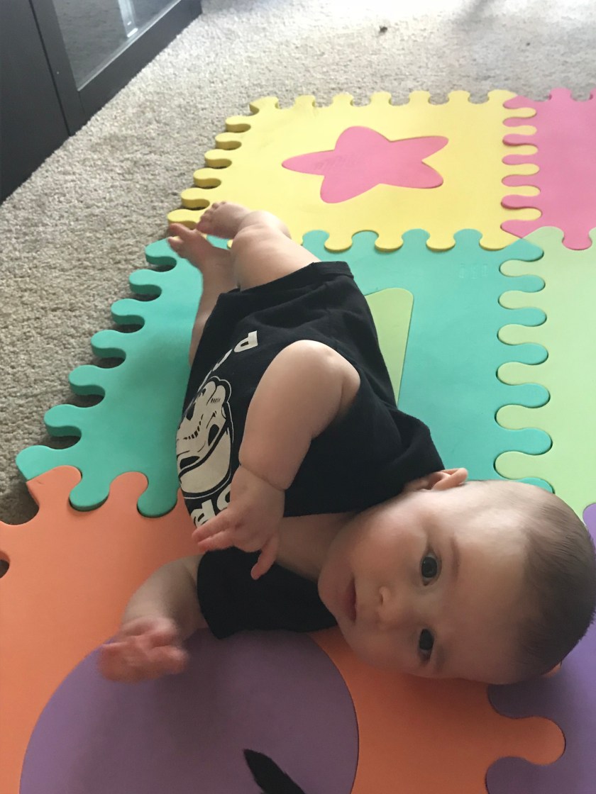 After a bit of time he wanted to be on his back again, so we put him on his back, and he again tried to roll over, still unsuccessfully.