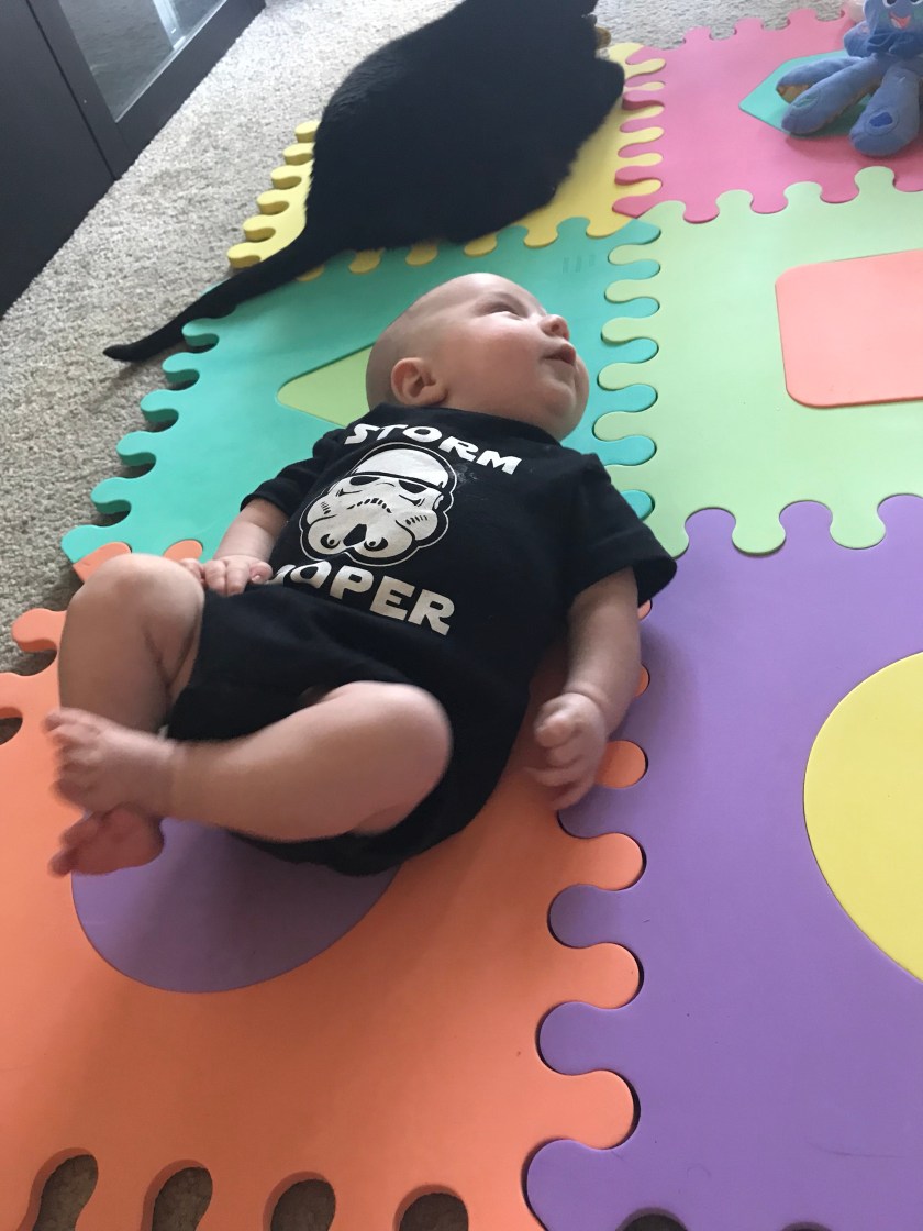 As aforementioned he reminds me so much of me in this photo. It’s funny as he’d be in his bassinet next to me as I sleep and with a peek through panel, it’s possible he’s seen me sleep like this, or it could just be a tendency he has from me without ever having seen it demonstrated. Either way he looked so happy.