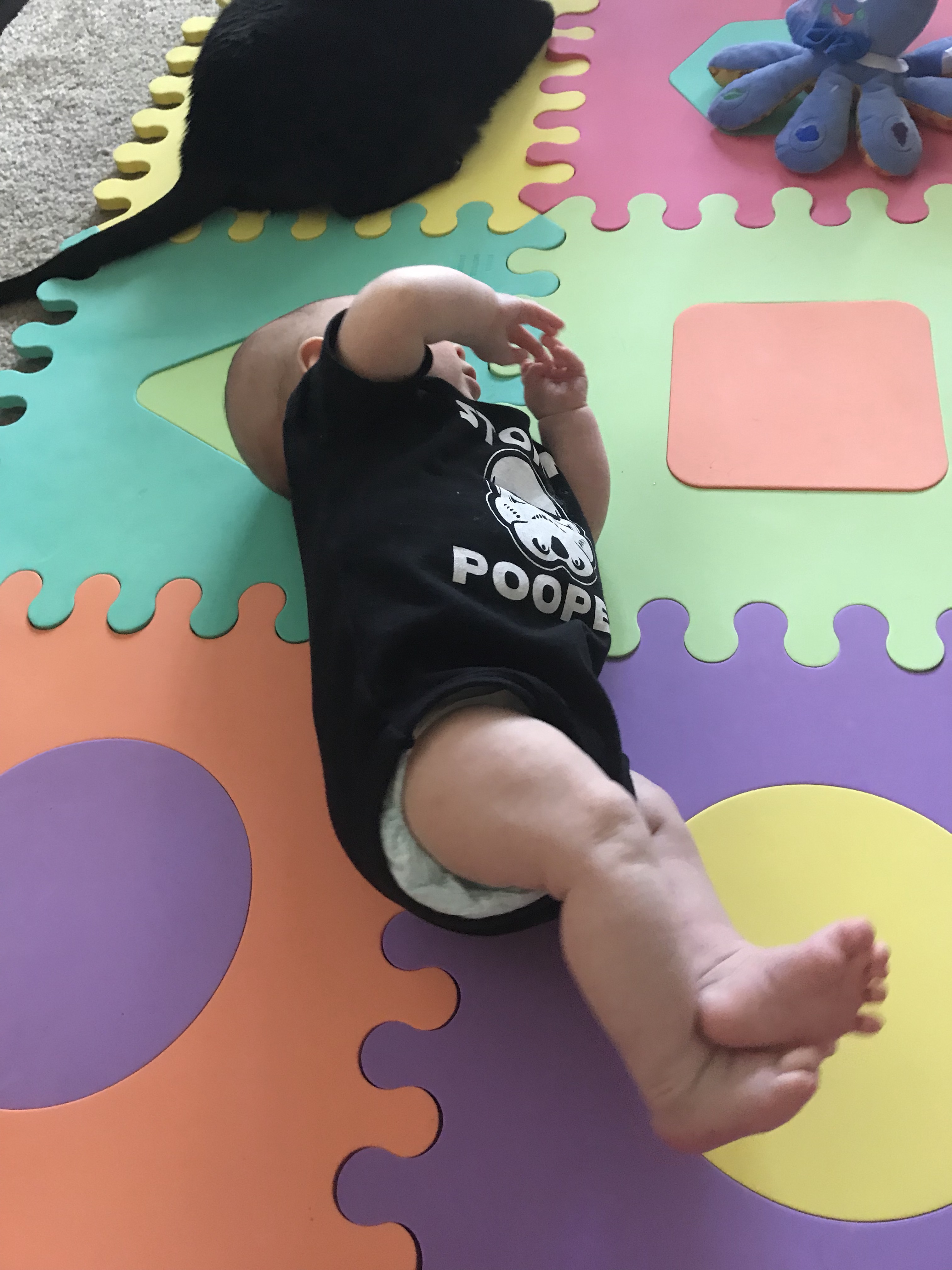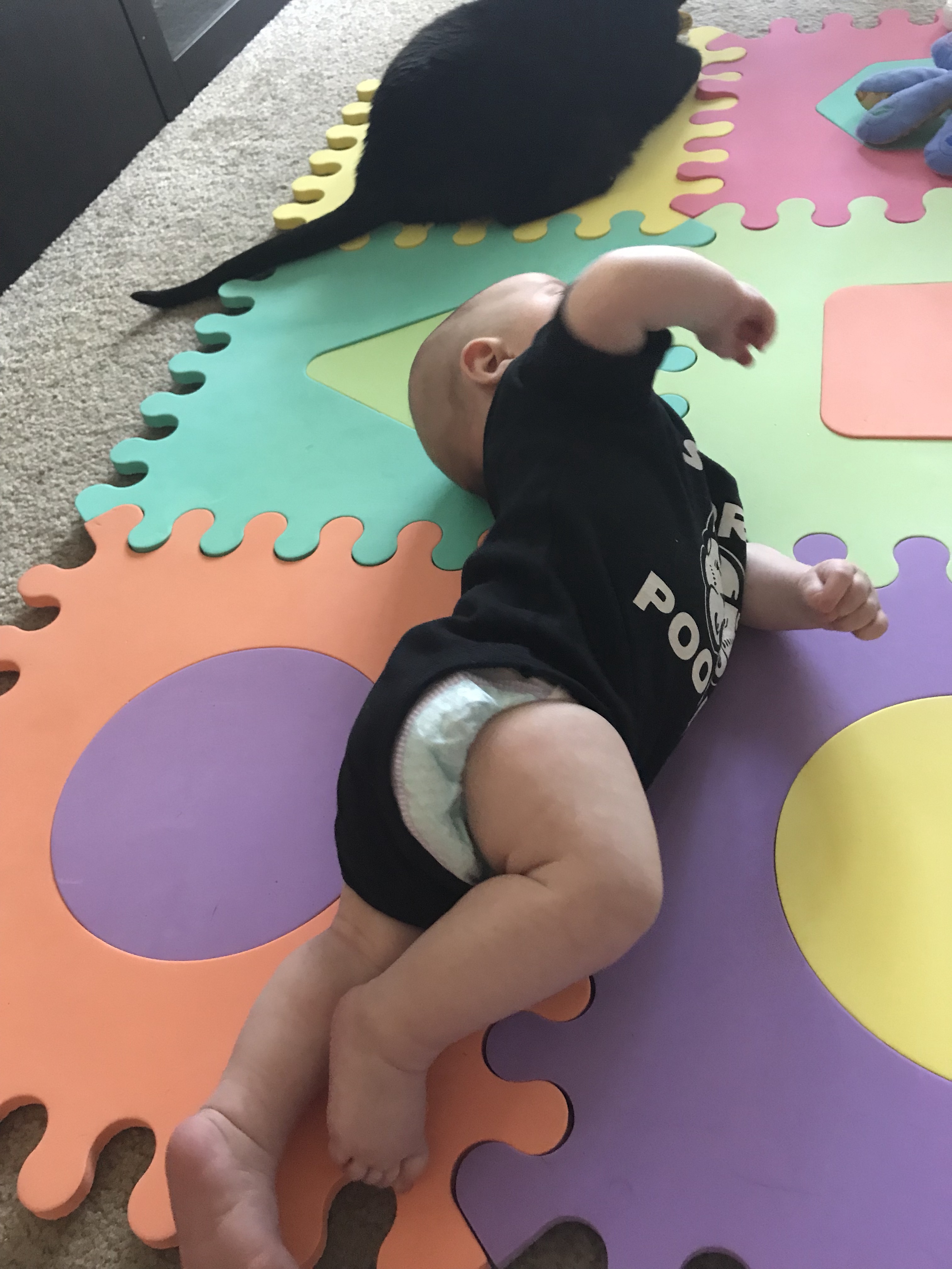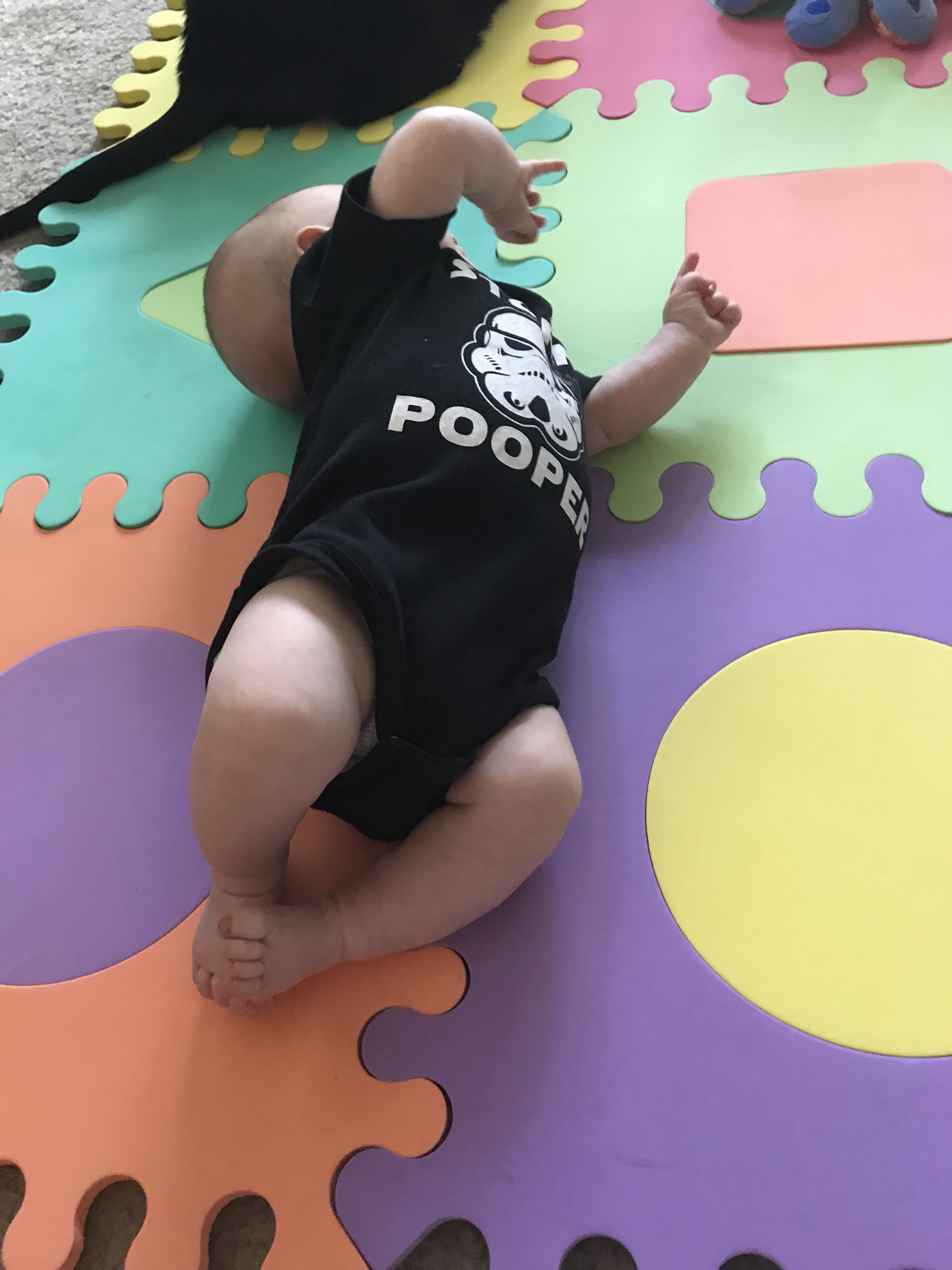 After a bit of time he wanted to be on his back again, so we put him on his back, and he again tried to roll over, still unsuccessfully.