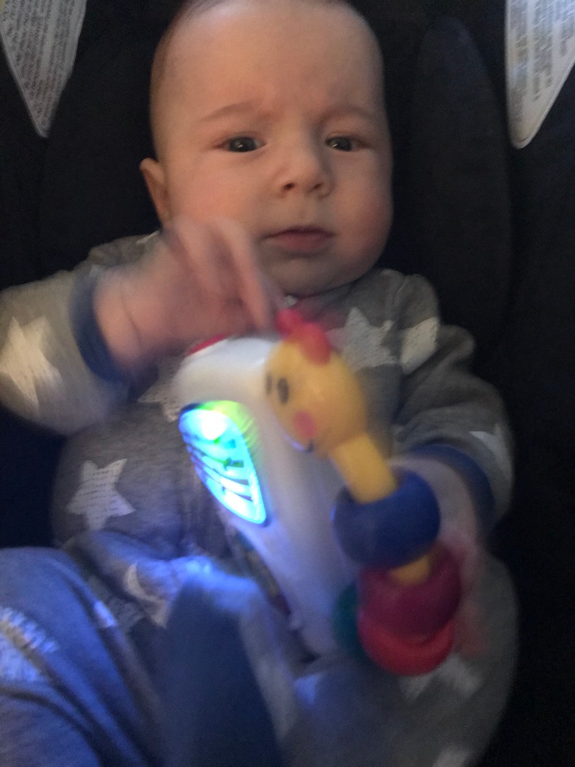 When it’s playing songs,the screen lights up different colors including green, red and blue. William definitely likes looking at the screen as it plays music, it was a bit hard to get him look at me instead of it for this picture.