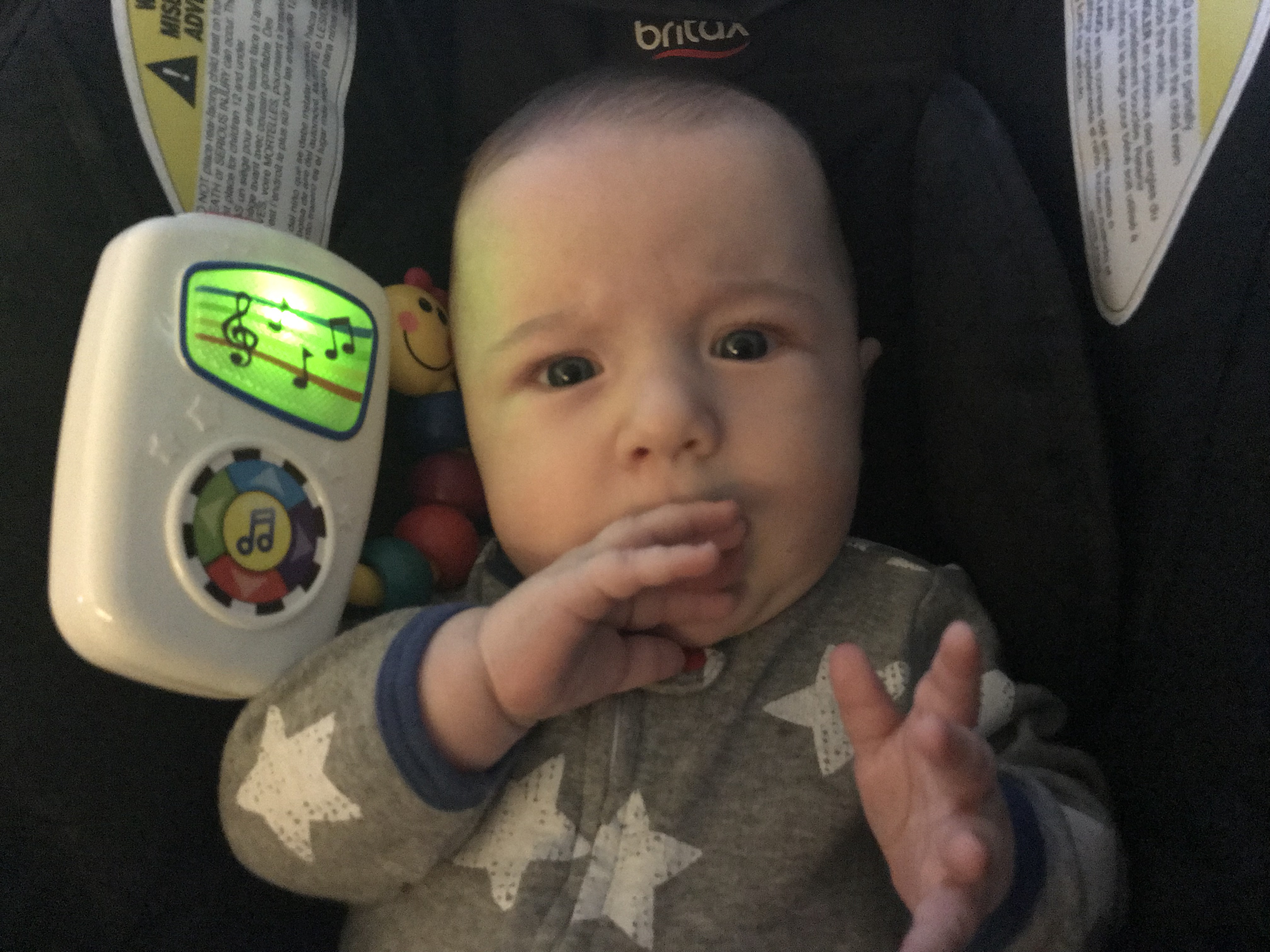 When it’s playing songs,the screen lights up different colors including green, red and blue. William definitely likes looking at the screen as it plays music, it was a bit hard to get him look at me instead of it for this picture.