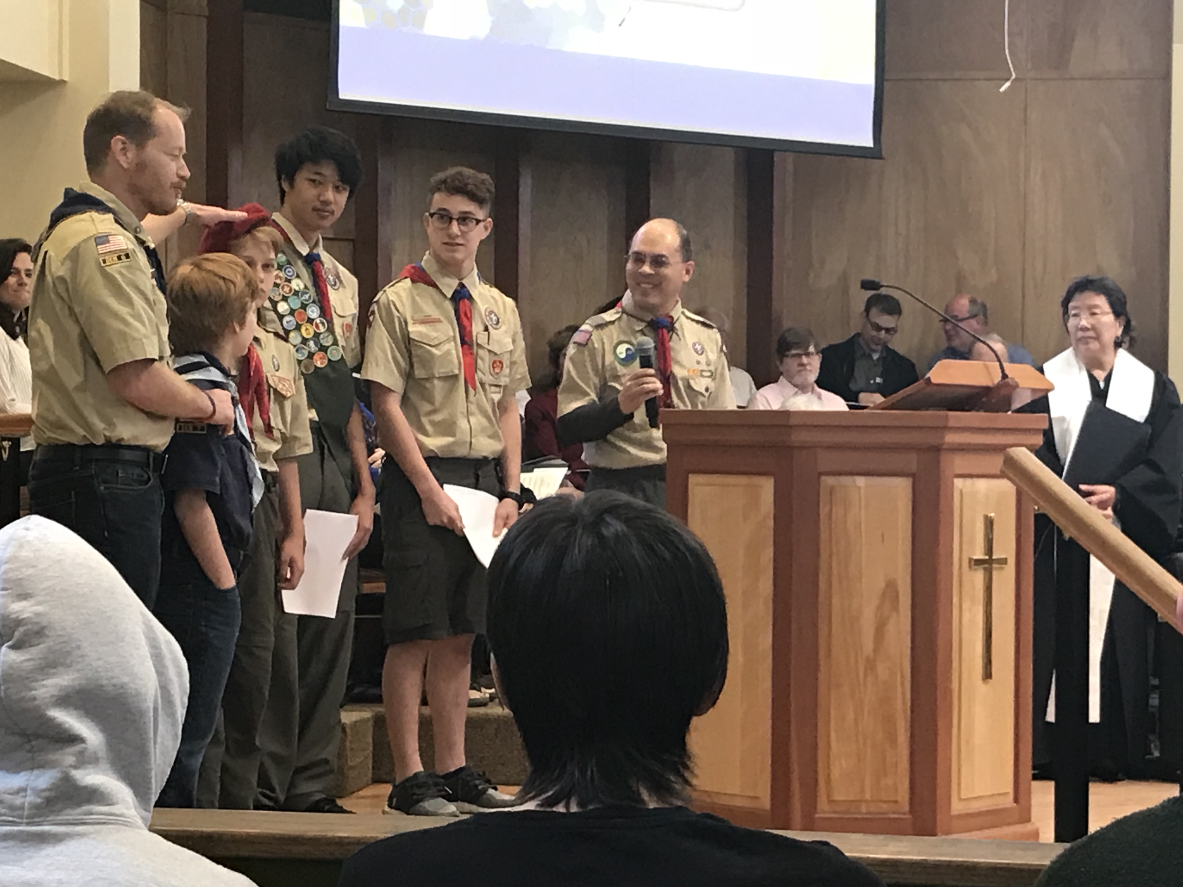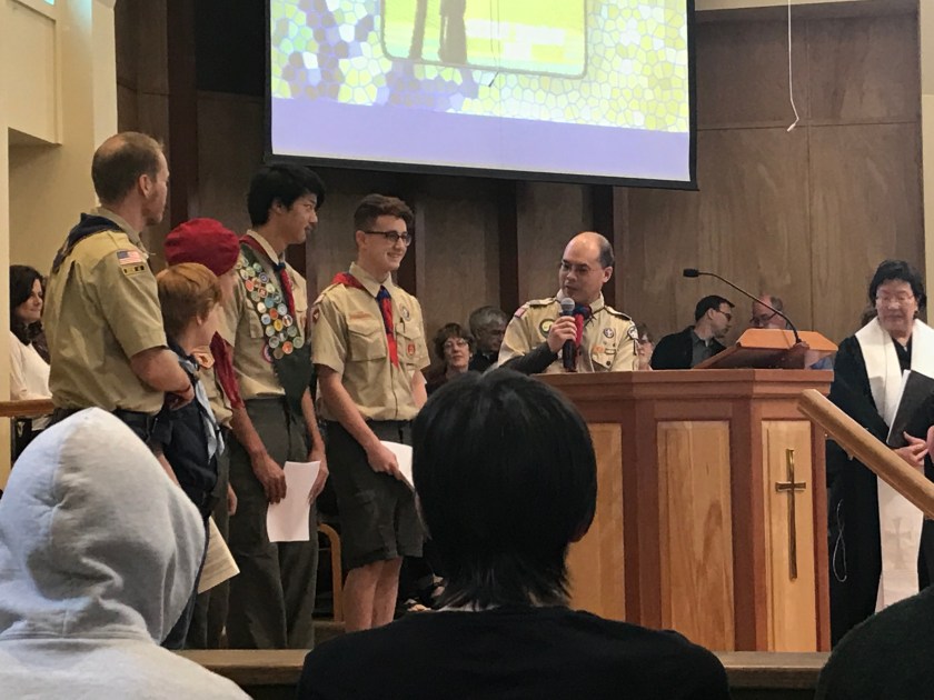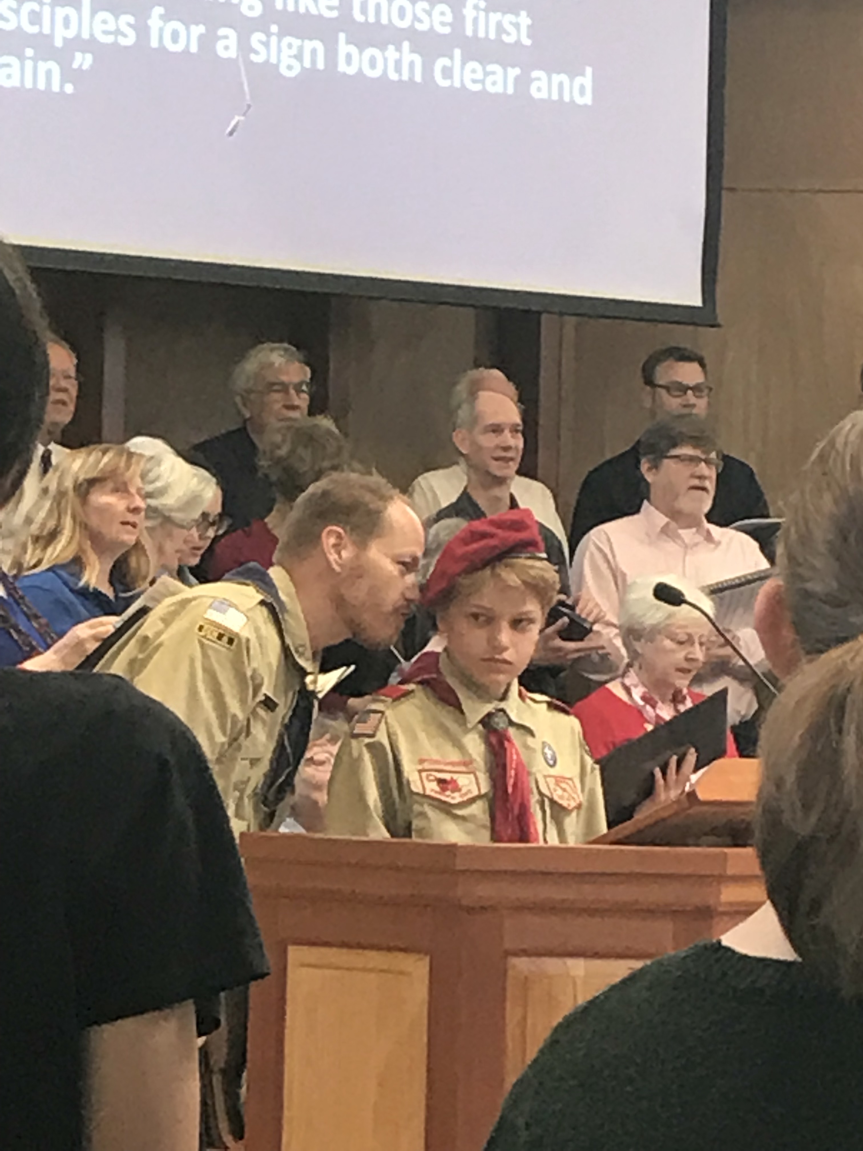 It took me a bit longer to get William settled down so we could go to church today. I had debated bringing him into service with me, but as he’d been crying so hard on and off from teething pain (even after trying Infant Tylenol and teething toys), so I put him into the church nursery. As a result, I missed the opening candle lighting by a Girl Scout. The special service featured local Cub and Boy Scouts including Tim, who leads a Boy Scout pack and his son, Riley, a Boy Scout.