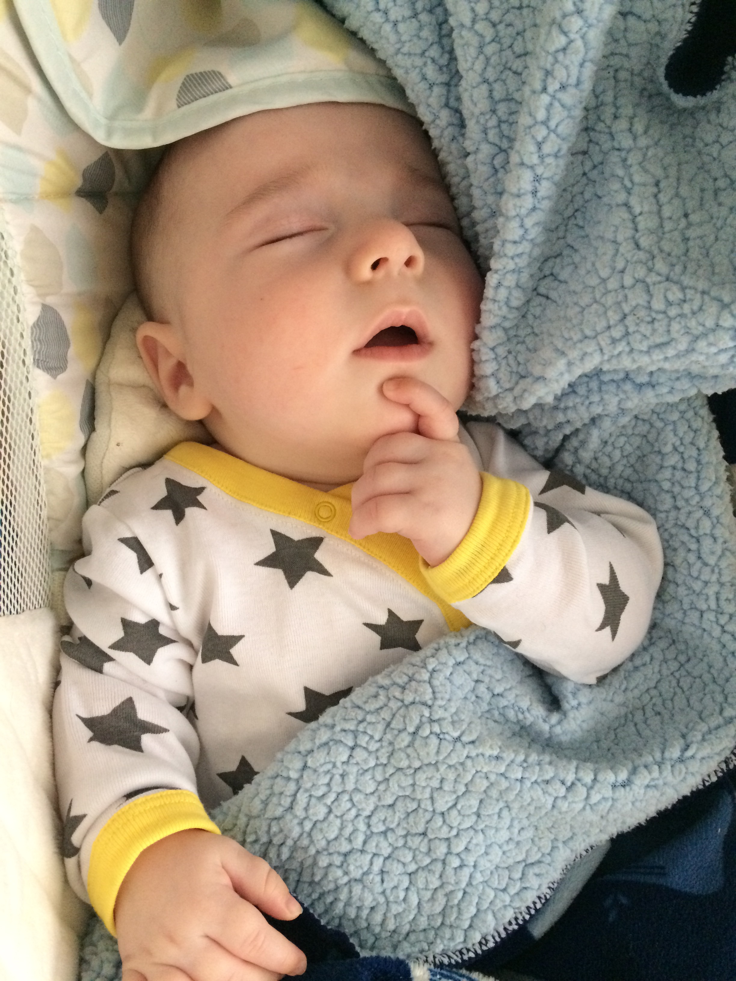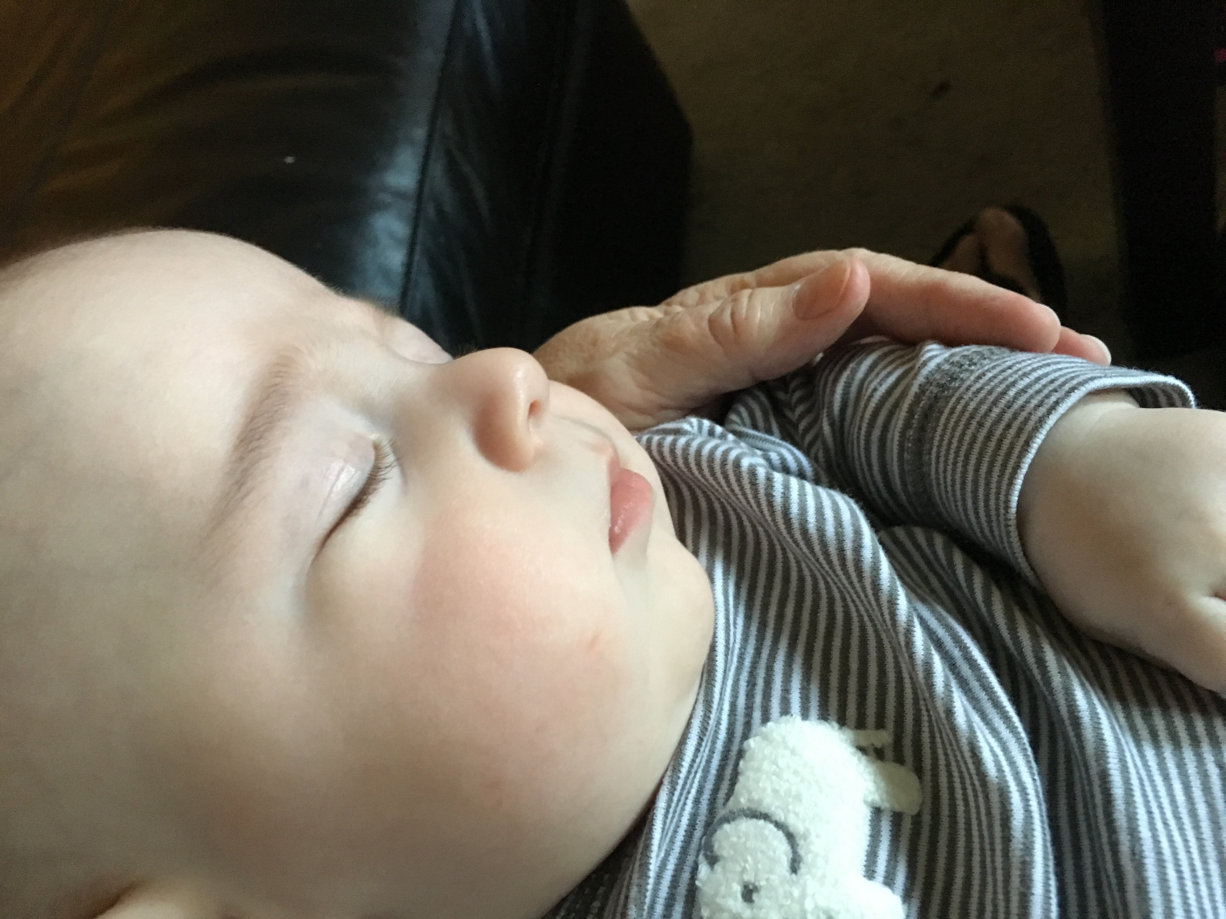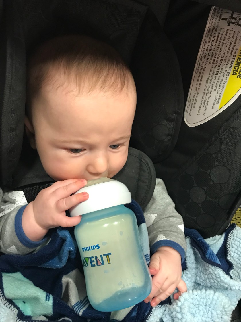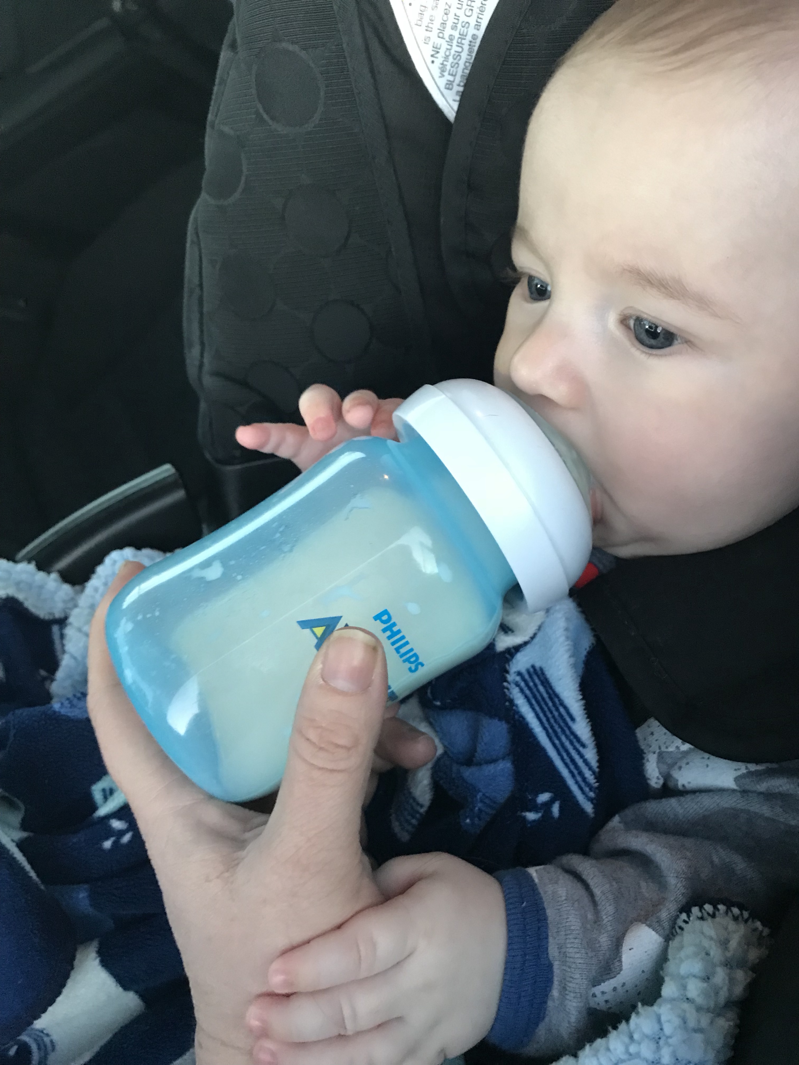 In the above photo he uses his right hand to drink, and his left to hold onto me. It’s hard to know which someone might consider his dominant hand (at the moment). Candy thinks he may grow up to be a lefty as she’s seen him suck his left thumb, and yet he seems to use both hands equally around me.