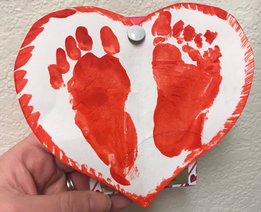 While the other two boys in her care were old enough to make help out with their Valentines a bit more (and put their hand prints in a heart), William was able to get his footprints on this one for us.