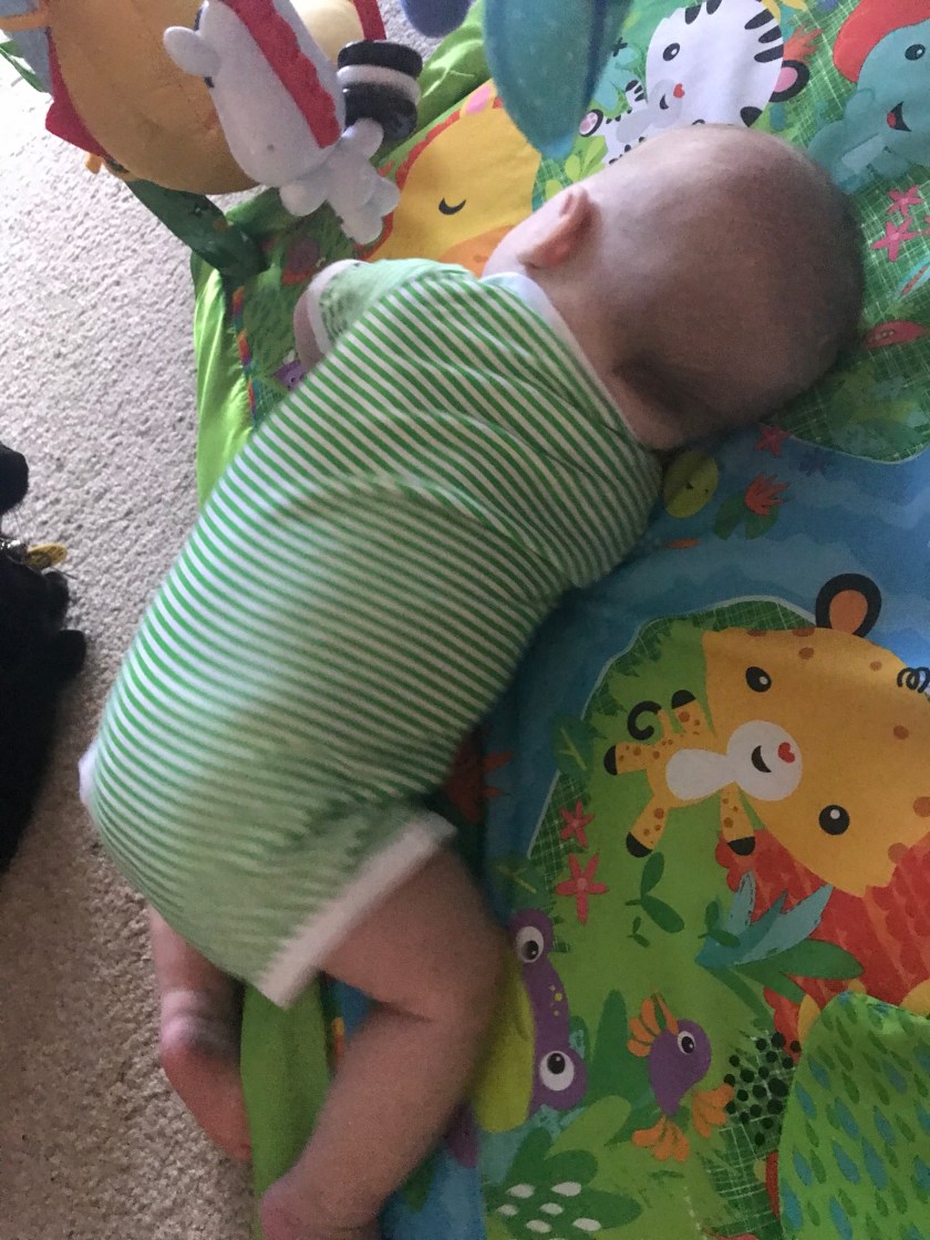 So since he is rolling about we needed a way to keep him warm that would be OK safety wise with him rolling about. It was time to put him in his Sleep Sack which I’ve heard described as a wearable blanket. When we put him in it for the first time, we put him on the fleece blanket on the couch to watch his reaction and to spend time with him before we would put him to bed.