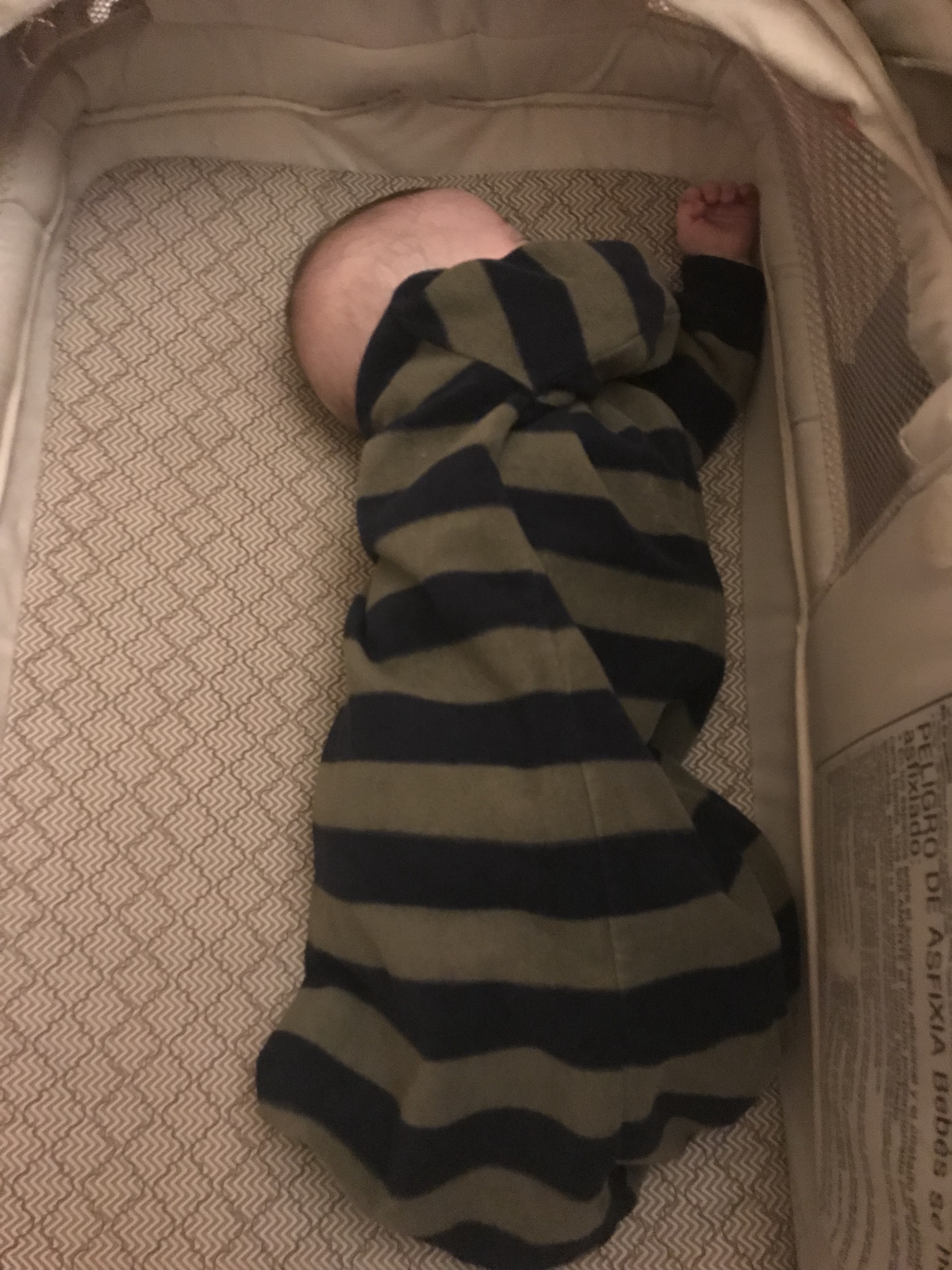 Now that he can roll and stay on his stomach, just putting him to bed on his back is no longer a guarantee that he will stay in that position to sleep. In fact, he’s very likely to have many positions throughout the night. That means that swaddling, a technique used to help him stay warm and somewhat in place since his birth is one we can no longer use on him at night.