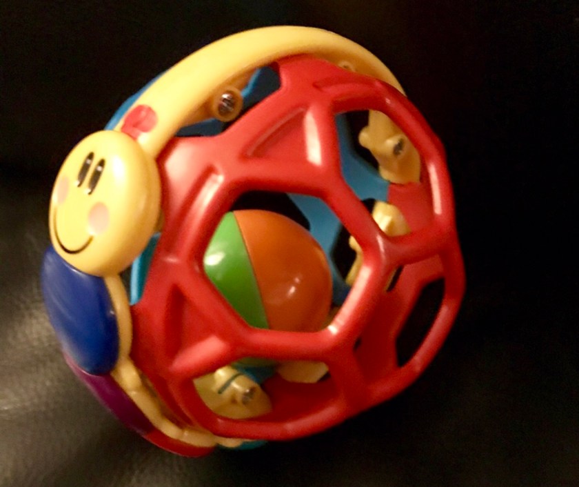 The bright colors, and rattling sound of the ball inside make it a toy that can hold his interest for quite a long while, such as when getting him ready to go out on a trip.