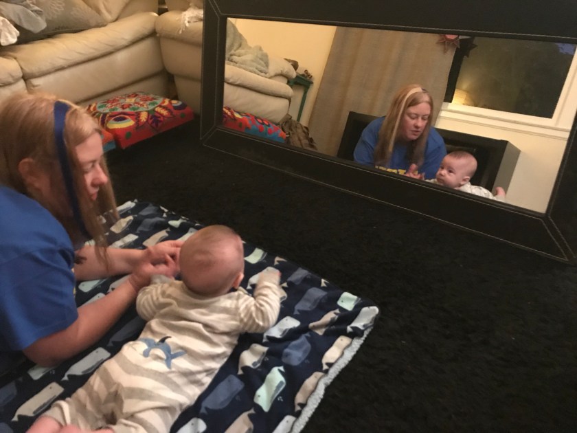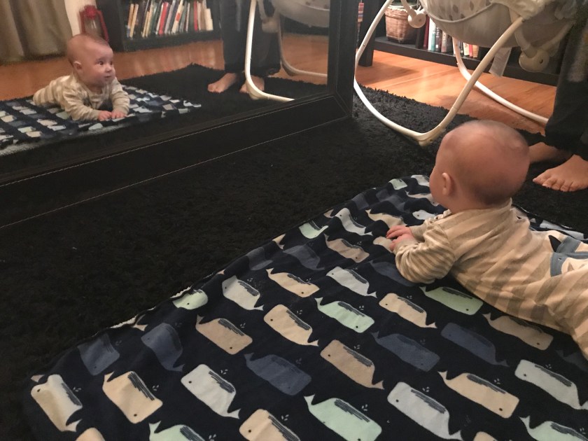 Several people have suggested that William will crawl towards things when he has something he wants to crawl towards. Mirabel has been working to set him up so he can crawl towards his own reflection.
