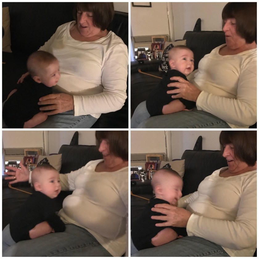 It’s fun hearing him babble as I know those babblings are the foundation for words. While he won’t babble at his reflection (or that of the person holding him), he definitely does seem interested in seeing reflections. I think he enjoyed the bright colors on my shirt and hair clips for College Spirit Day at work (in honor of March Madness).