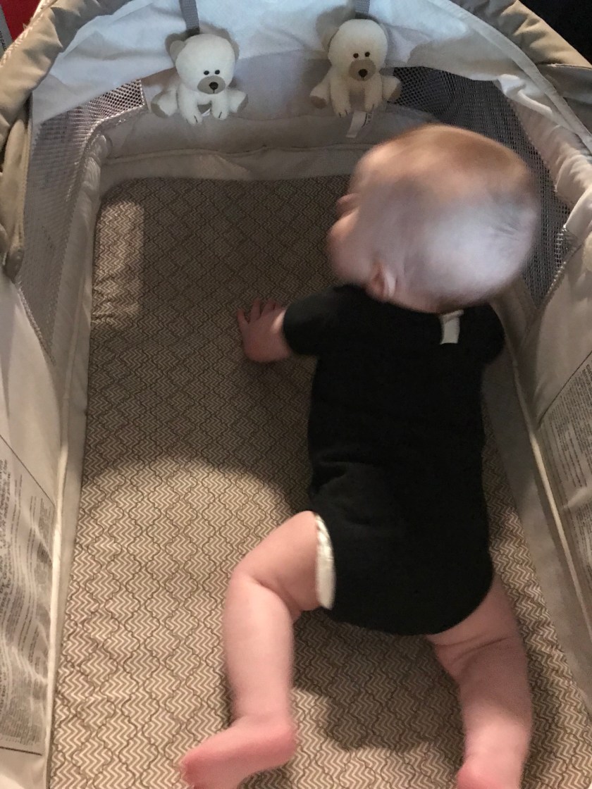 This marked the first night he’d slept in the crib in our place. He woke up around the times he normally would to breast feed, so he got many hours of sleep with some breaks in between.