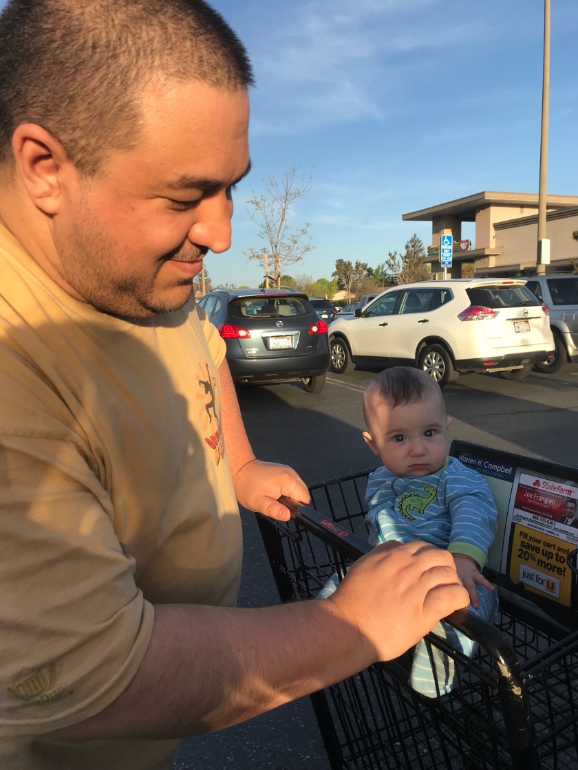 Matt and I almost always do grocery shopping on Sunday evenings. Tonight he told me as William was almost six months (his official day being six months is tomorrow), that perhaps it was time to shop with him sitting up more. At first, I thought Matt meant in the stroller without the car seat, but he meant directly in the cart top basket part.