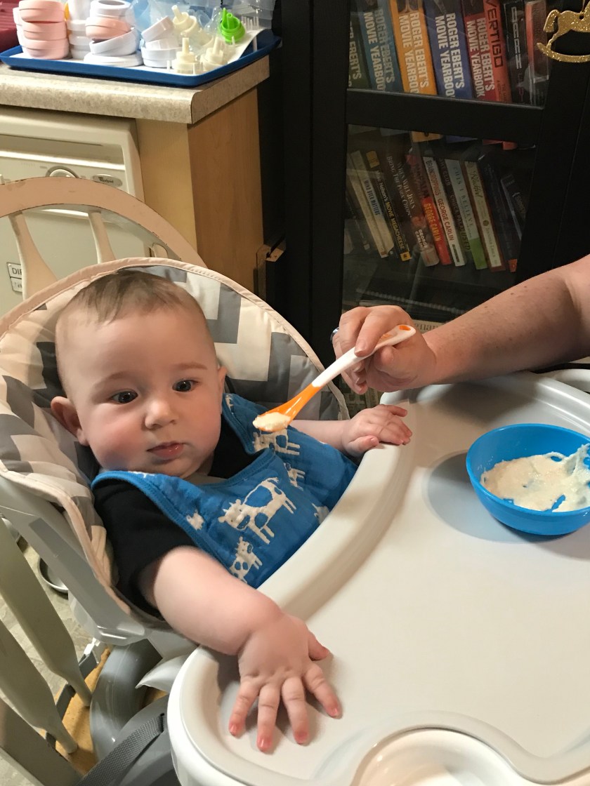 I’ve been looking forward to starting William on solid foods for a while. Even though a few people tried to nudge us to starting early, I held strong that he would start at six months. Over the weekend we had him practice sitting in his high chair on the ground to get used to it. Then, we put him fully in his chair, on a chair and prepared to give feeding him solids a shot.
