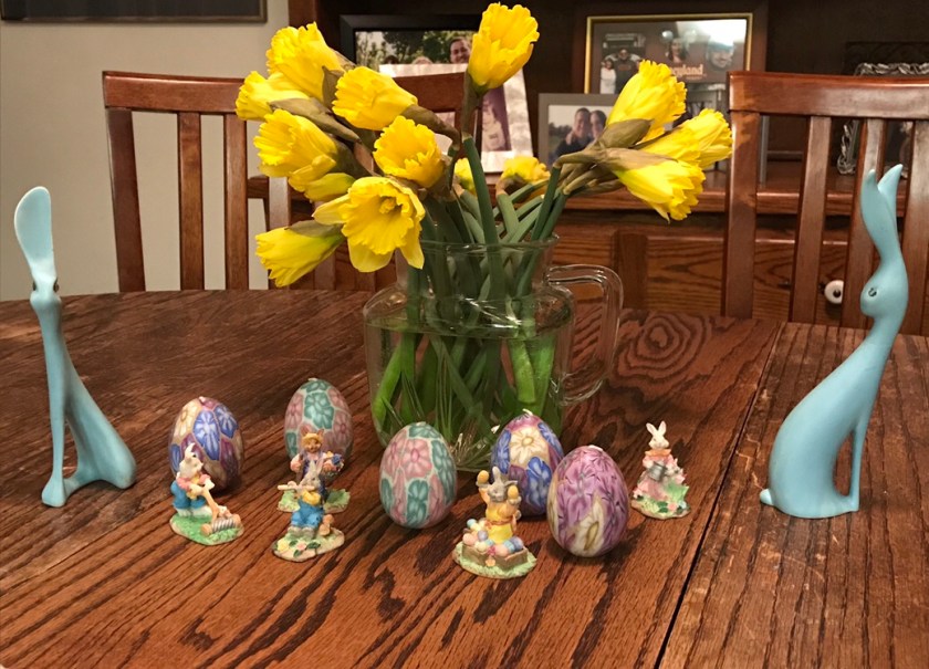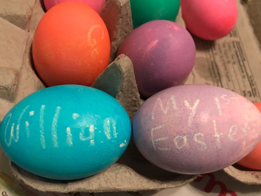 Last year Candy had made William a green egg reading “Baby” on as I was waiting till the birth to learn the baby’s gender. This year I dyed some for him.