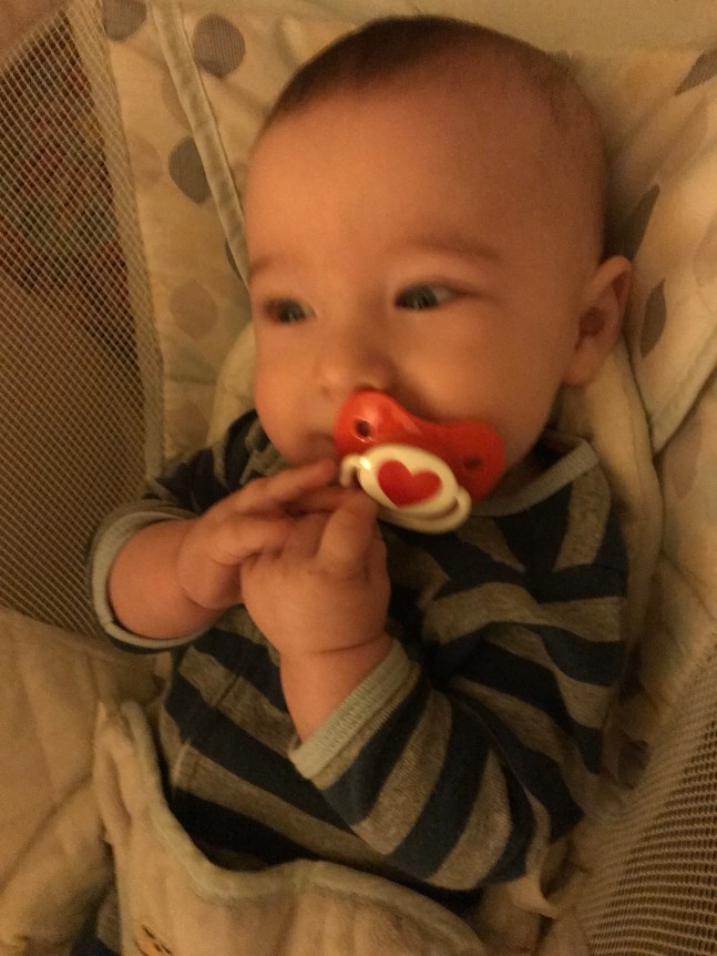I realize this photo isn’t well focused on his face. Yet, it’s too adorable not to share. Candy discovered he’s enjoying pacifiers now, at least to use as a teething toy.