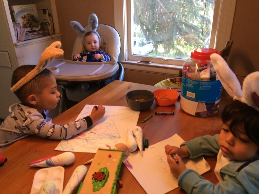 For the Easter activities at Maribel’s house, he was a great with his bunny ears and watching from a high chair. He did try to put a crayon in his mouth, and unfortunately he’s a ways away from being able to color.