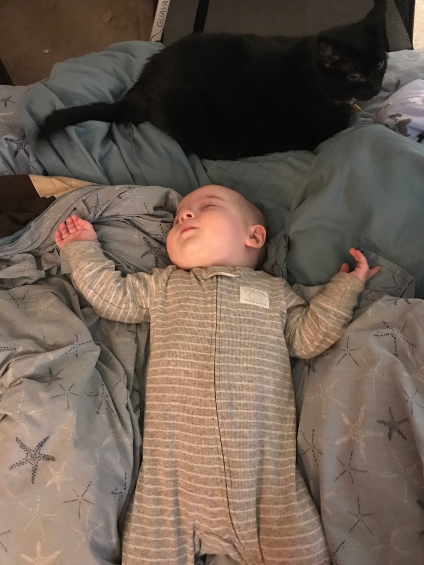 Although he isn’t allowed to sleep in a bed per se, occasionally he will fall asleep while playing with us on a bed. Here Inky is guarding him.