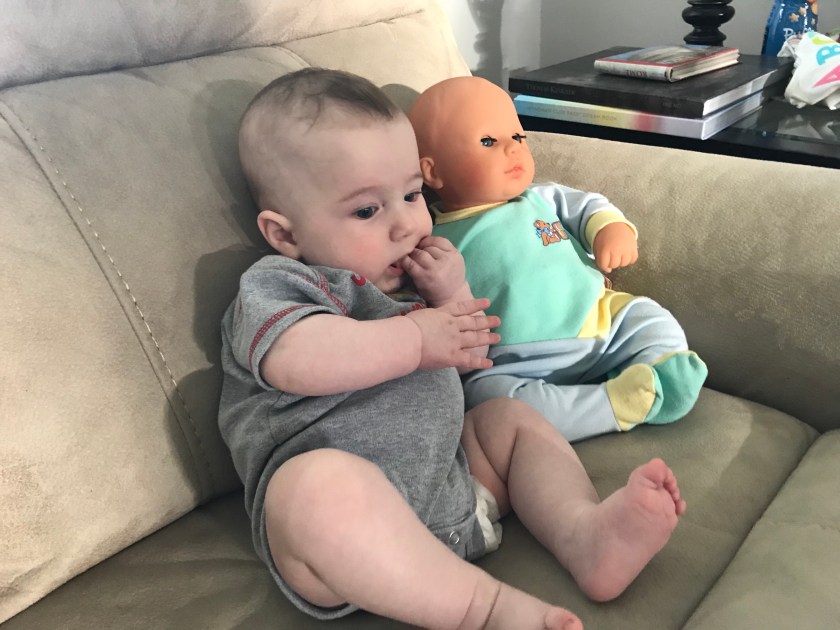 I just had to let him sit next to the realistic baby doll one of the girls had at Easter.