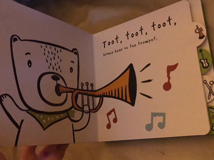However, the next page had a bear playing the trumpet instead of a tiger (which shows up later in the book). At this point I was pressing the tabs hard and in different spots and having little luck.