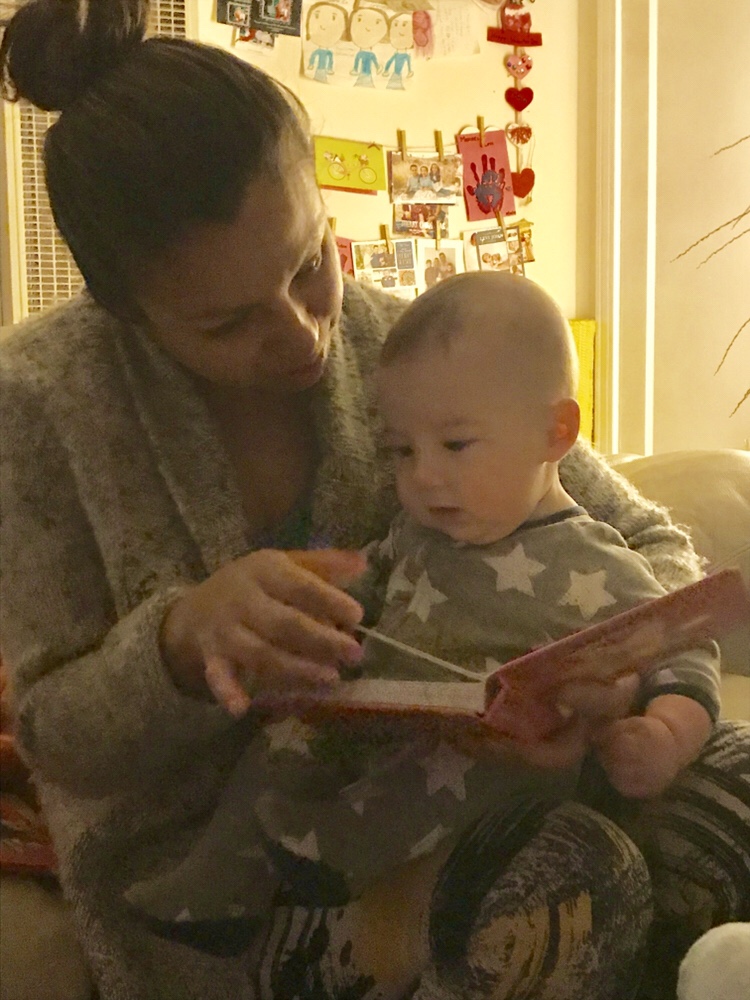 William is being read to here from “Colores”, one of four English/Spanish board books I’ve sent to day care with him. As I’ve read most baby’s brains start at about six months to determine what language(s) they will process natively, I’m so grateful he’s getting so much Spanish spoken around him.