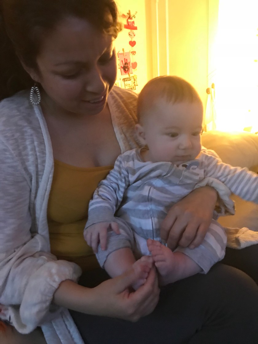 Maribel loves speaking to him in Spanish. One of the other children that she watches speaks it to her a lot also. He looks at Maribel so intently when she speaks to him in English or Spanish. I’ve read that by six months, babies brains have developed to be more receptive to the language or languages they hear often.