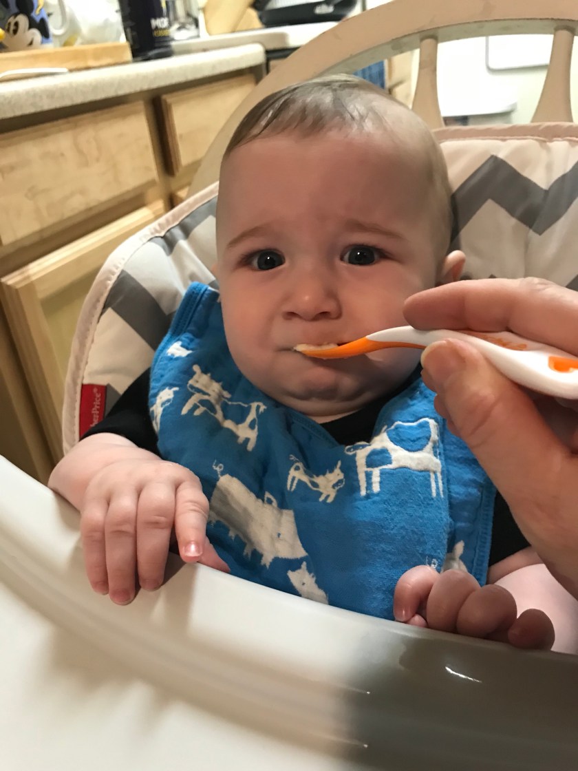 I’ve been looking forward to starting William on solid foods for a while. Even though a few people tried to nudge us to starting early, I held strong that he would start at six months. Over the weekend we had him practice sitting in his high chair on the ground to get used to it. Then, we put him fully in his chair, on a chair and prepared to give feeding him solids a shot.