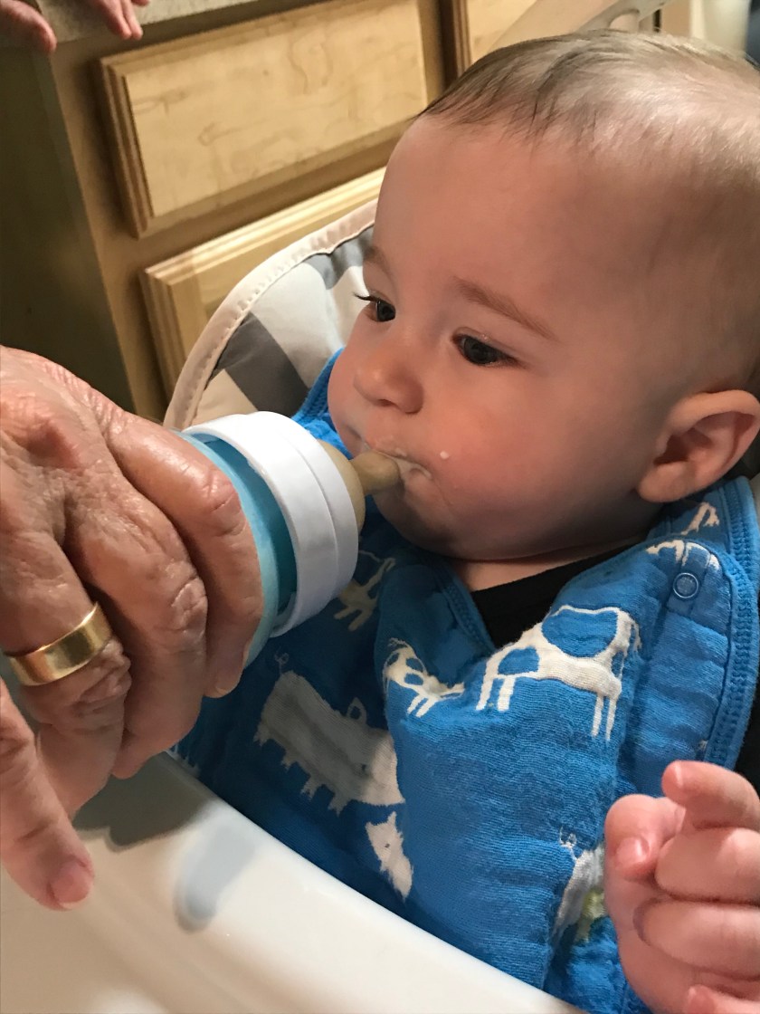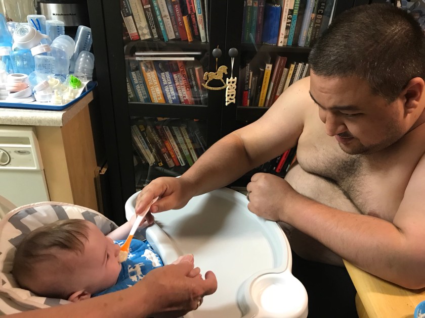 We each took turns trying to get William to eat his rice cereal mixed with warm formula. We used formula as we didn’t want to waste my breast milk in case he spit large portions out.