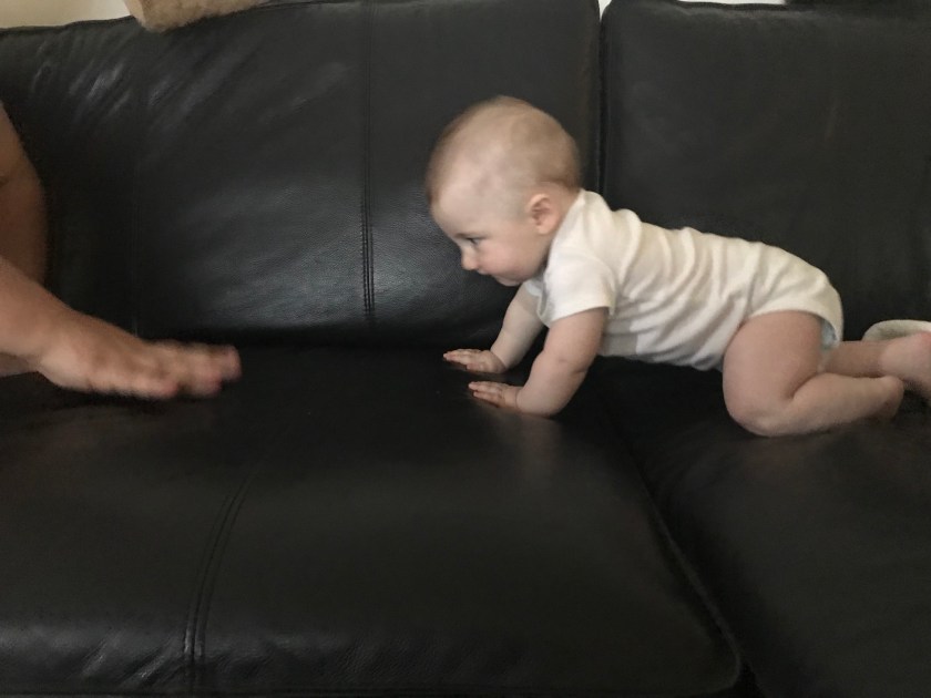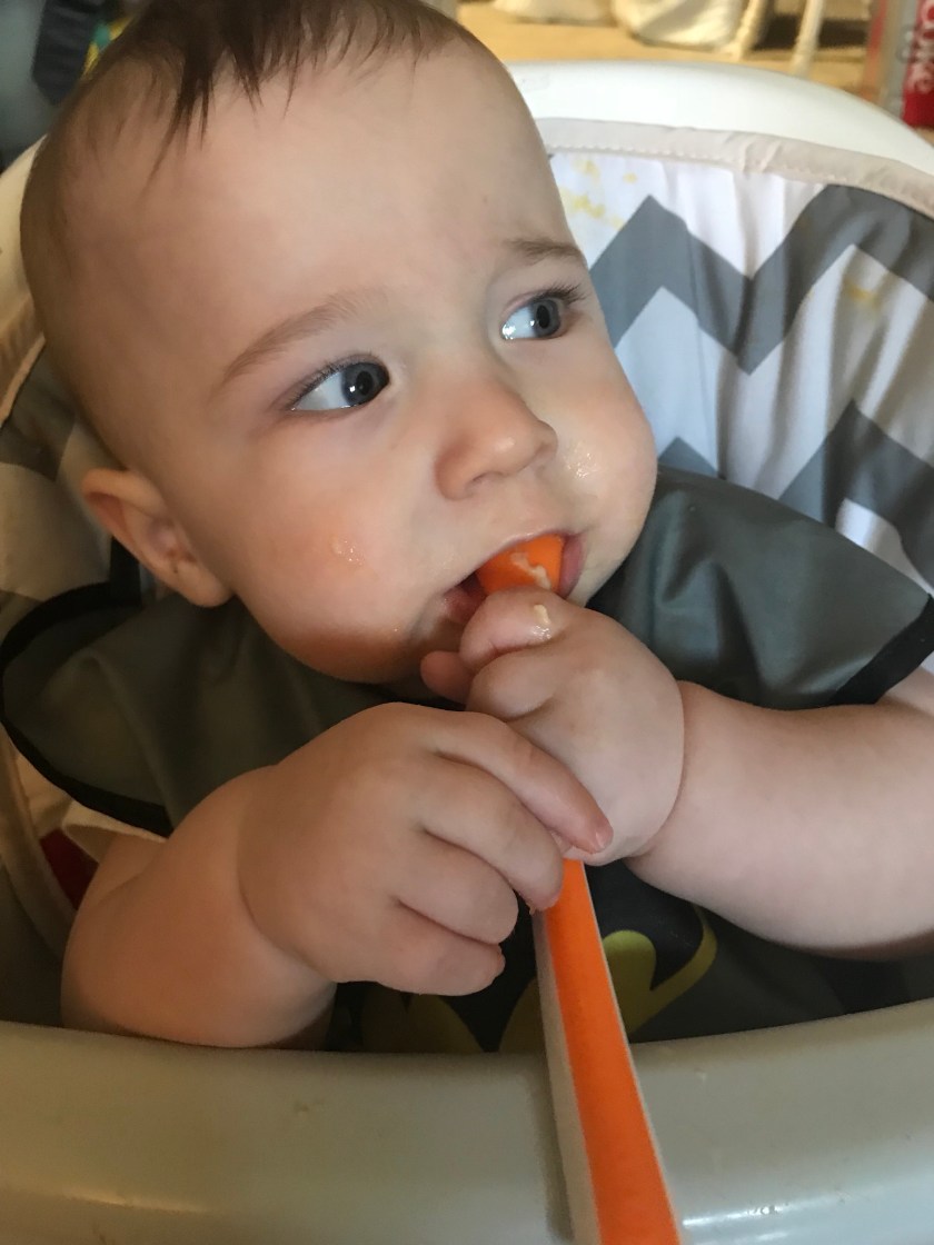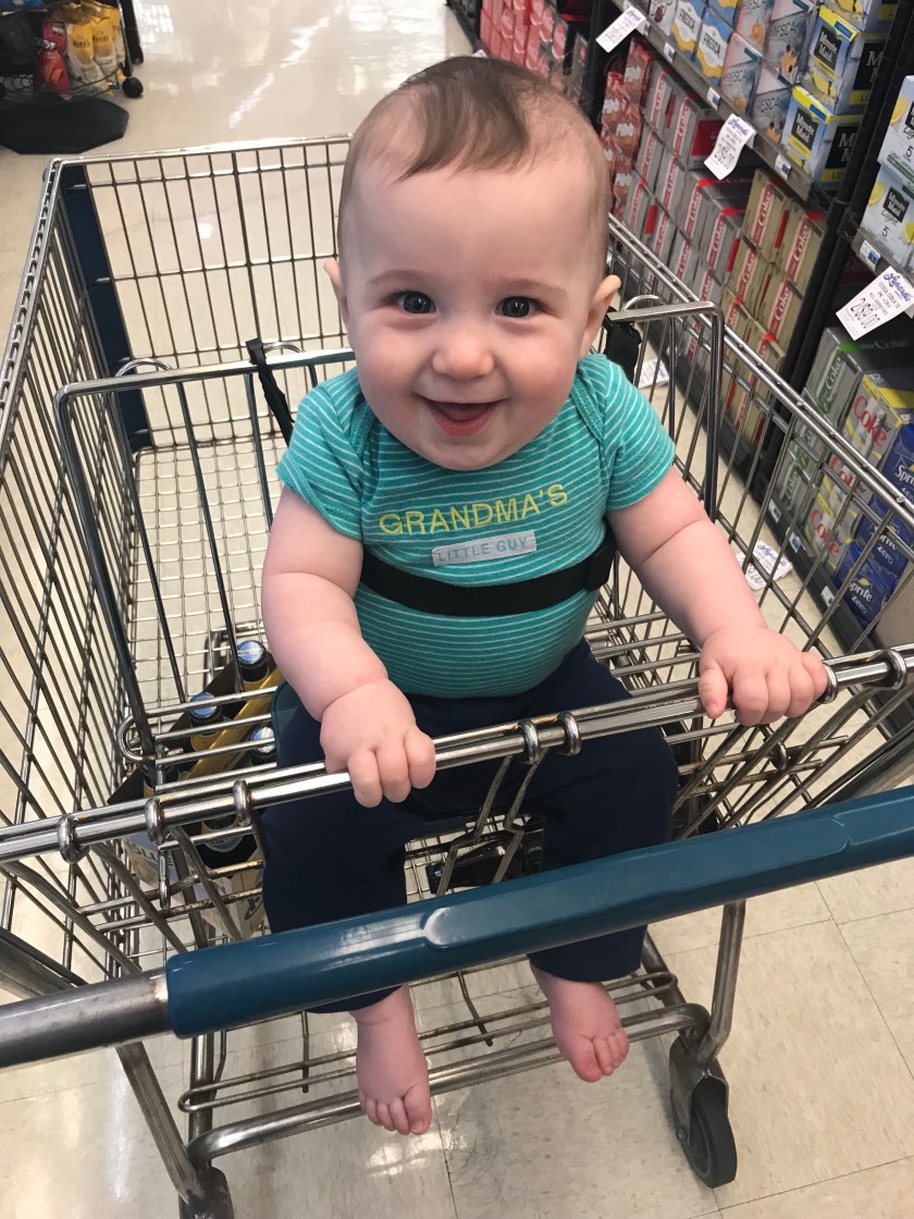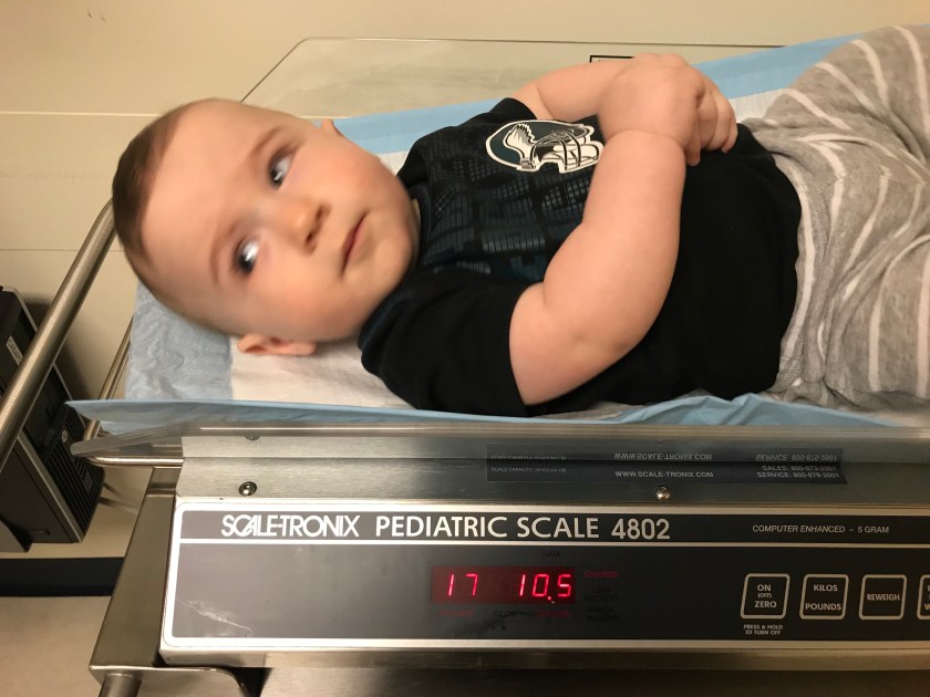 As this was not a developmental checkup, they weighed him with his clothes on. Here he seems to be giving the nurse the side eye for having him on the scale while clothed.