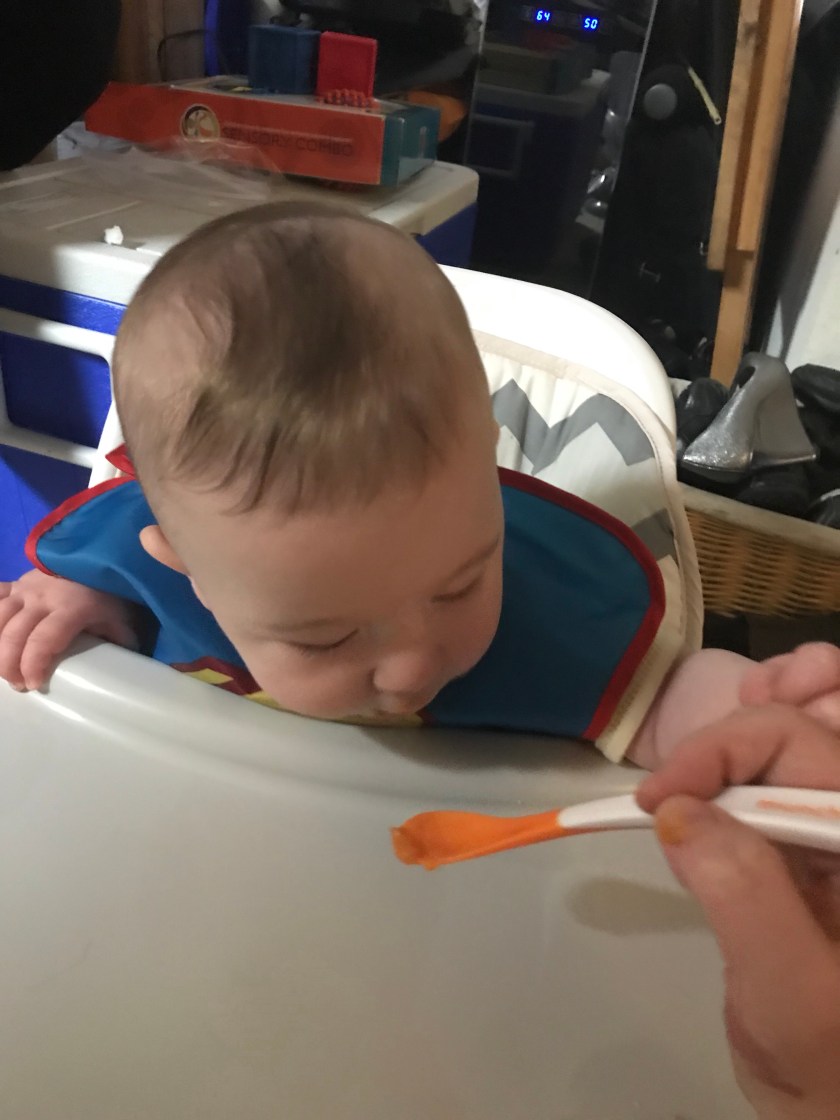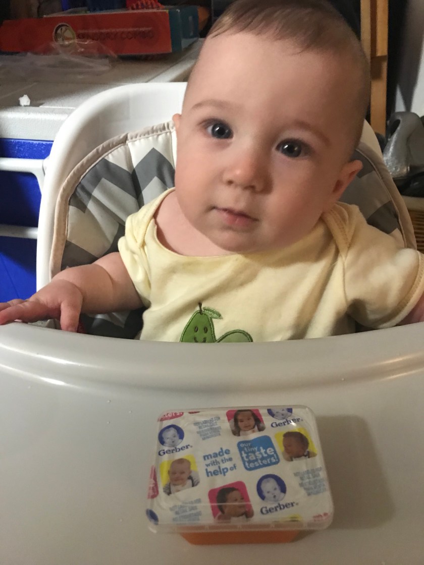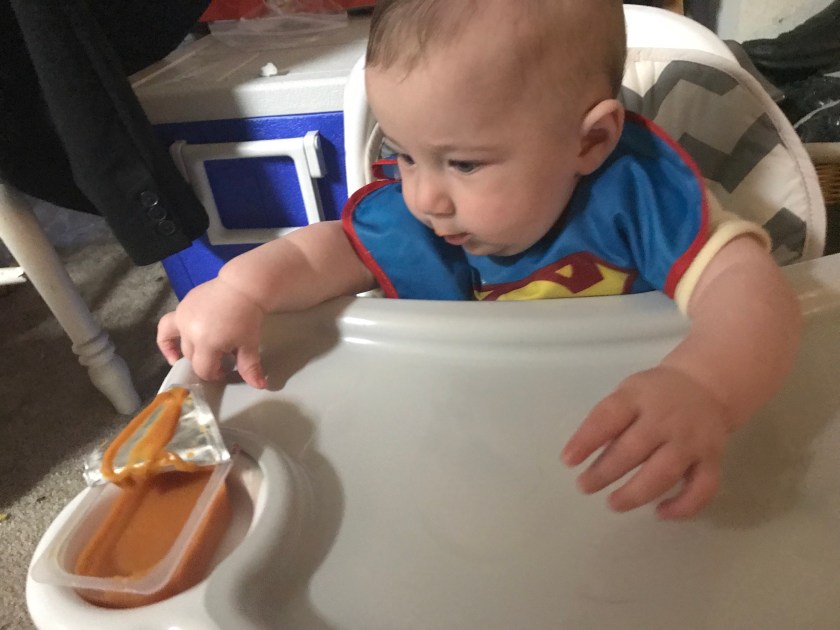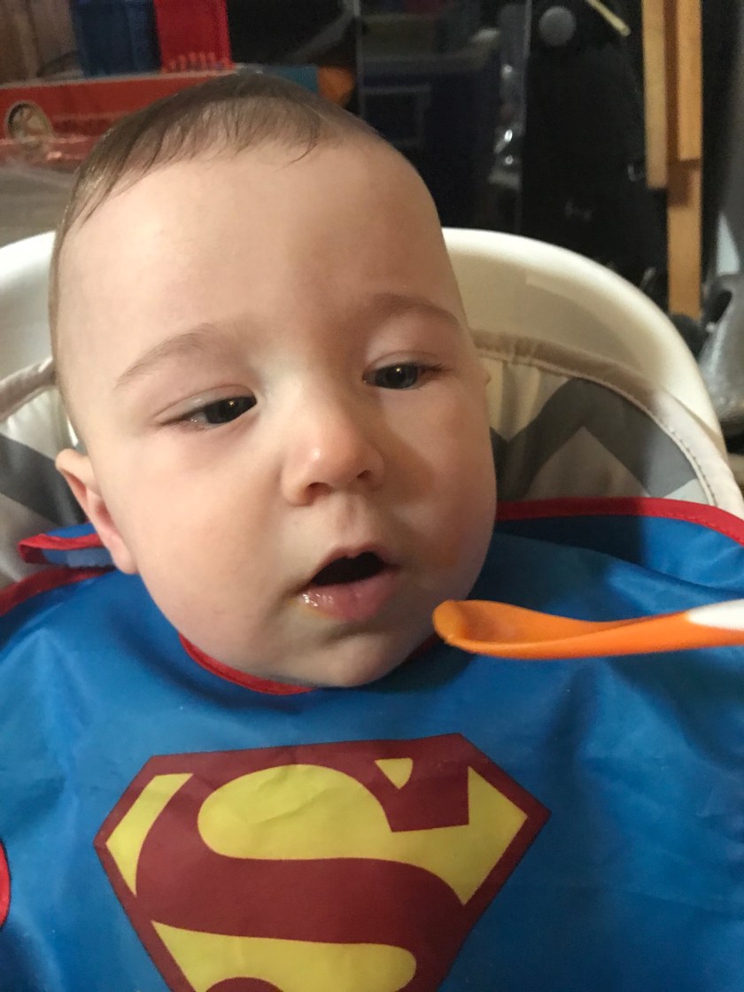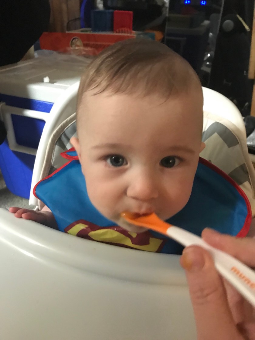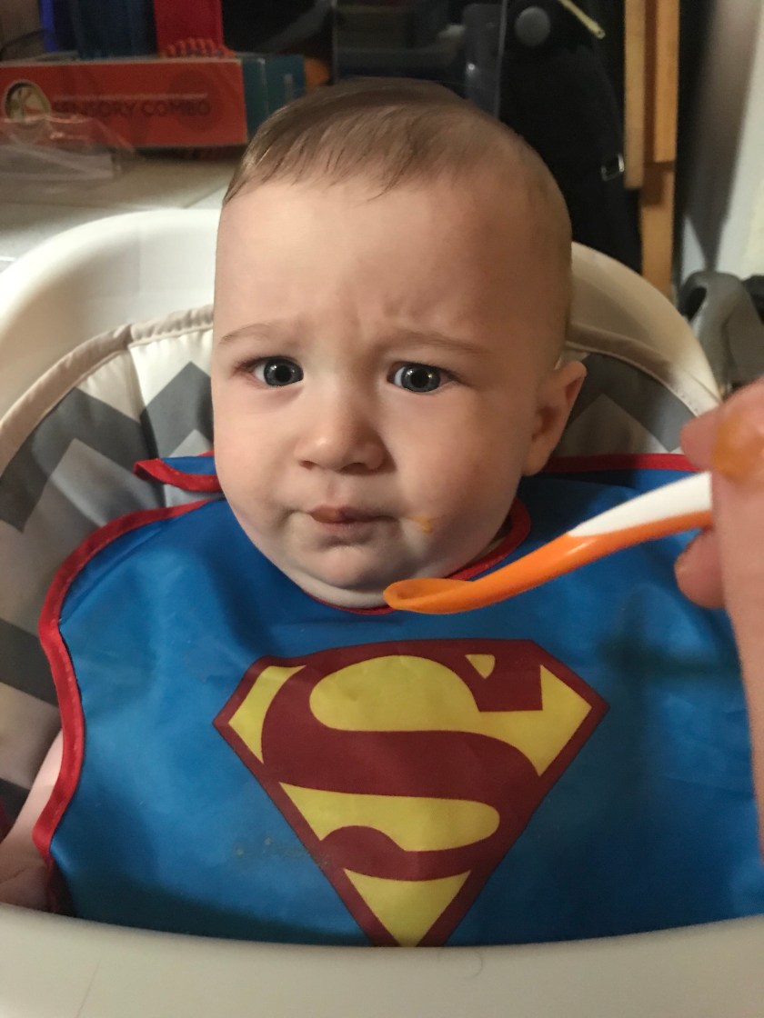 Wiliam’s doctor had recommended starting him with fruits then exploring vegetables. Today was the day we decided to try his first vegetable. In honor of this milestone, I put him in his Holy Guacamole vegetable onesie, a present from his Godparents, for his playtime before this meal.