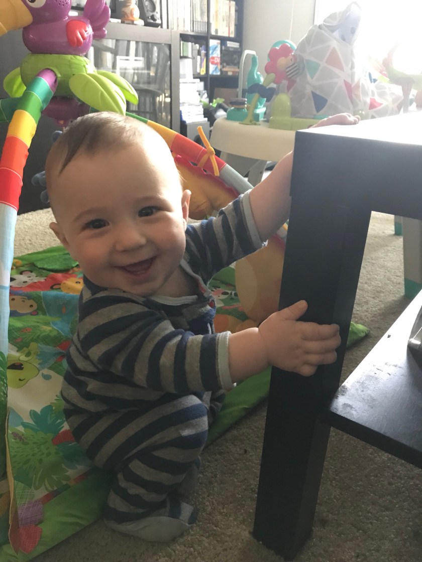 Matt and I were ready to see this moment happen. However, perhaps due to his age, lack of strength in his legs, just not being ready or something else, instead of pulling himself up, he instead sat back down. Still, it was great waiting to see if it was going to happen. William sees people walk often, including kids not much older than himself in daycare, I know he is eager to stand and walk someday.