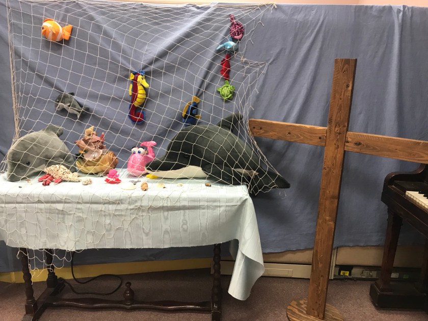The cooking station activity always starts with a lesson in the children’s room, then going to the hall with the kitchen attached for the main part. In the children’s room there was a lesson in song form. The room was decorated with toys about the sea for lessons about some of the apostles being fishermen.