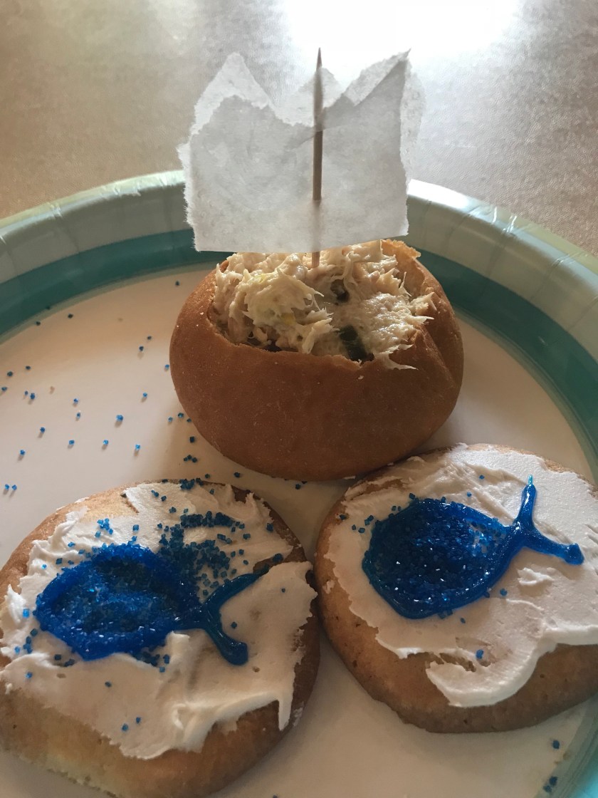 The message involved fishing as well. The boys added red fish to blue jello and made fishing boats with tuna, rolls and napkins as sails. They also decorated cookies with blue and white icing and frosting.
