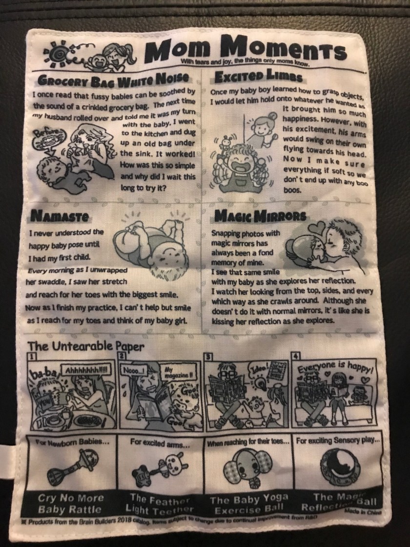 The toy is made to resemble a real newspaper with articles on it. The articles are about baby and parent related topics which makes for interesting reading. They can even be read to the baby like a book page.