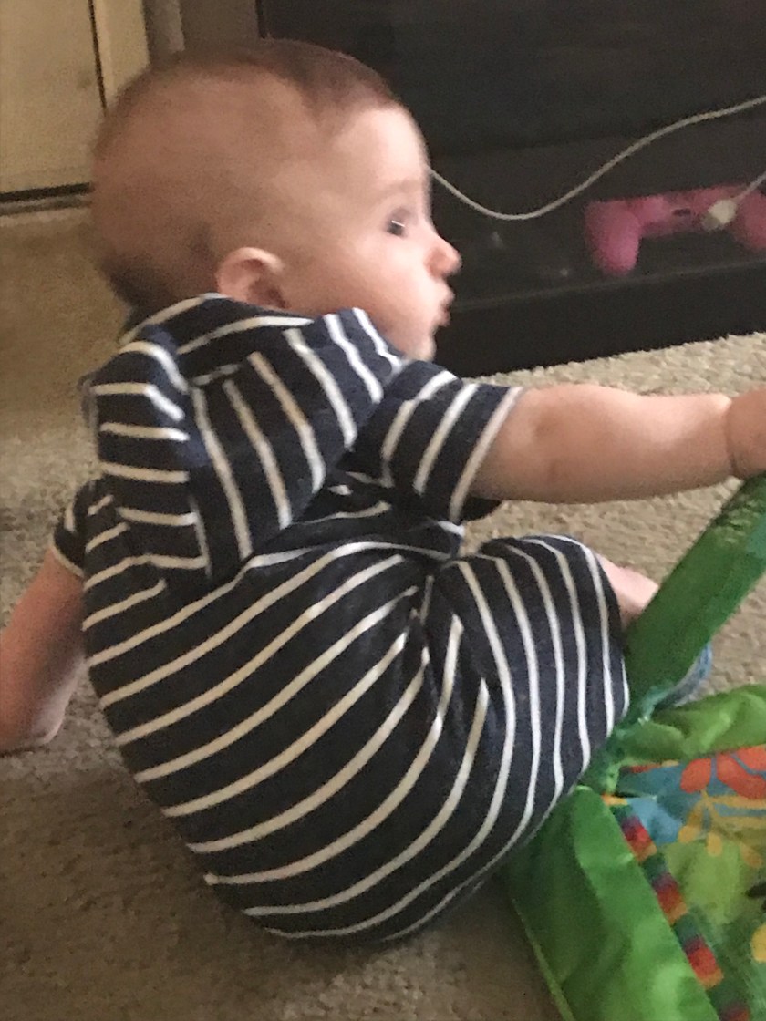 His continued flexibility amazes us. He loves grabbing his foot and though I didn’t get the moment in time, can bring it all the way up to his mouth so he can chew on his toes.