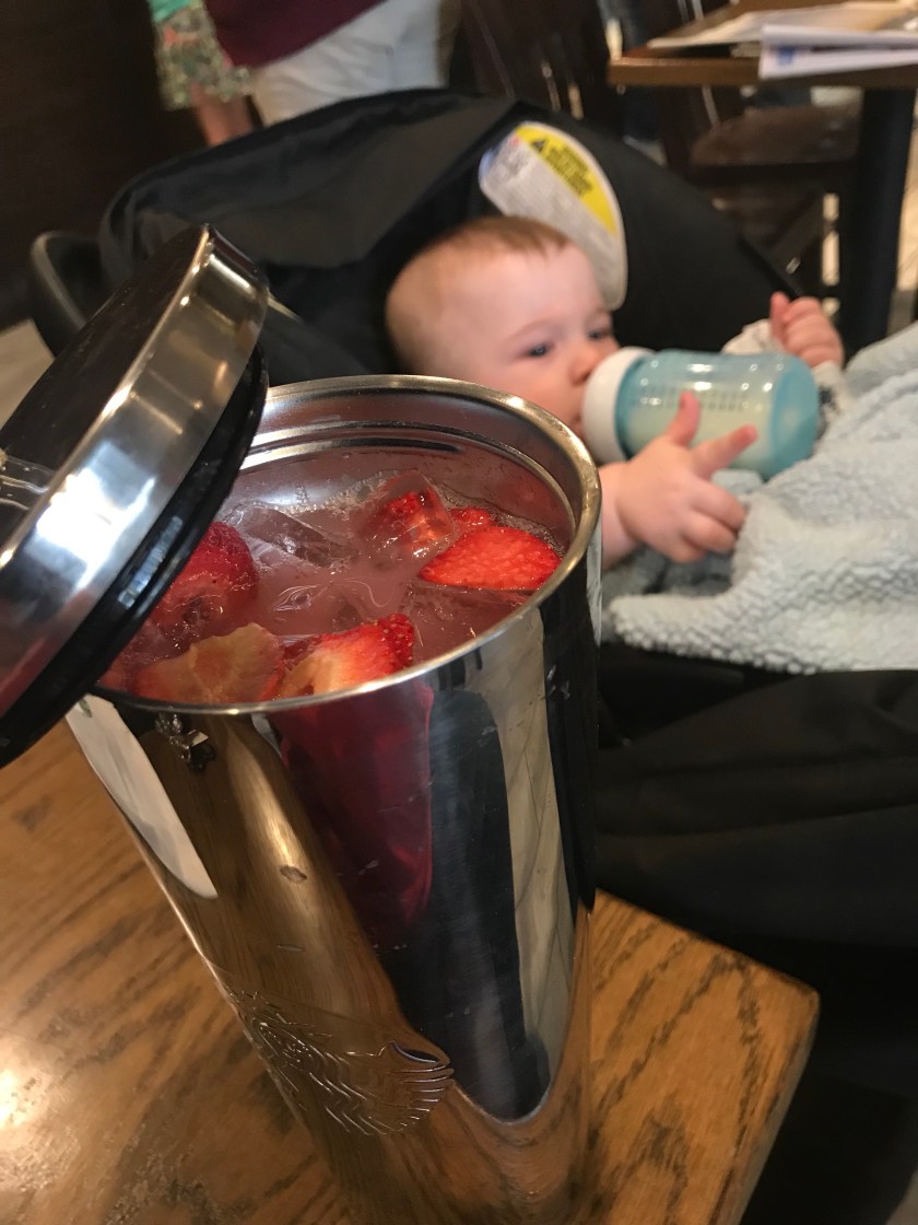 As he gets older William will often be content to be out and about around town. It was great to be able to stop and hangout in a Starbucks after an errand. I enjoyed their Pink Drink which is supposed to help boost milk supply, though I haven’t noticed that much of a difference. Later, I gave him a few strawberries that were softened in my drink and he appeared to use them.