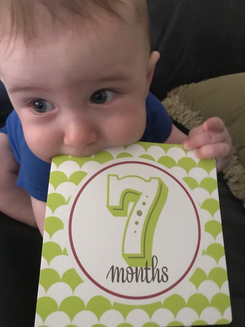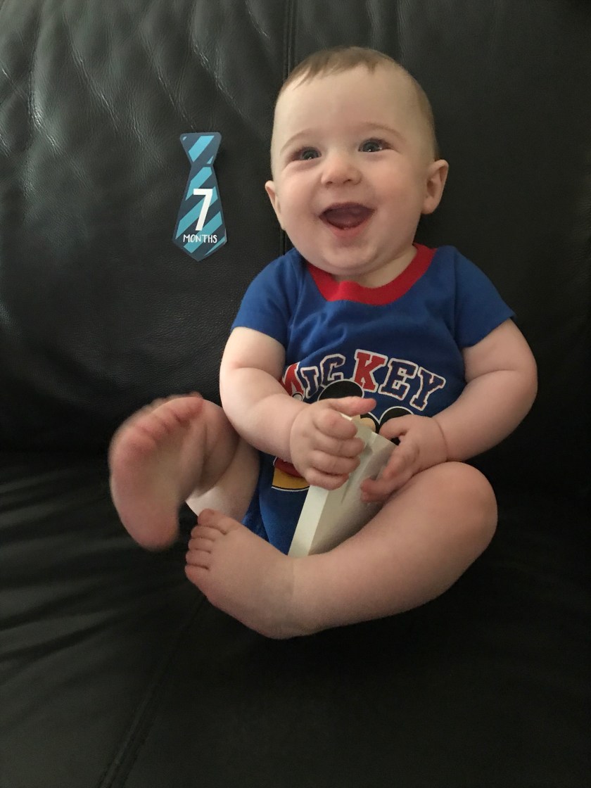 For William’s seven month photo shoot I went with a Mickey theme as he has some adorable Mickey clothes and a stuffed Mickey that is a present from his Godparents. Matt warned me before I started the session that putting him on the couch, the usual spot would not work as he was in an active mood. Even though it was a short time before his bedtime, it turns out Matt was right.