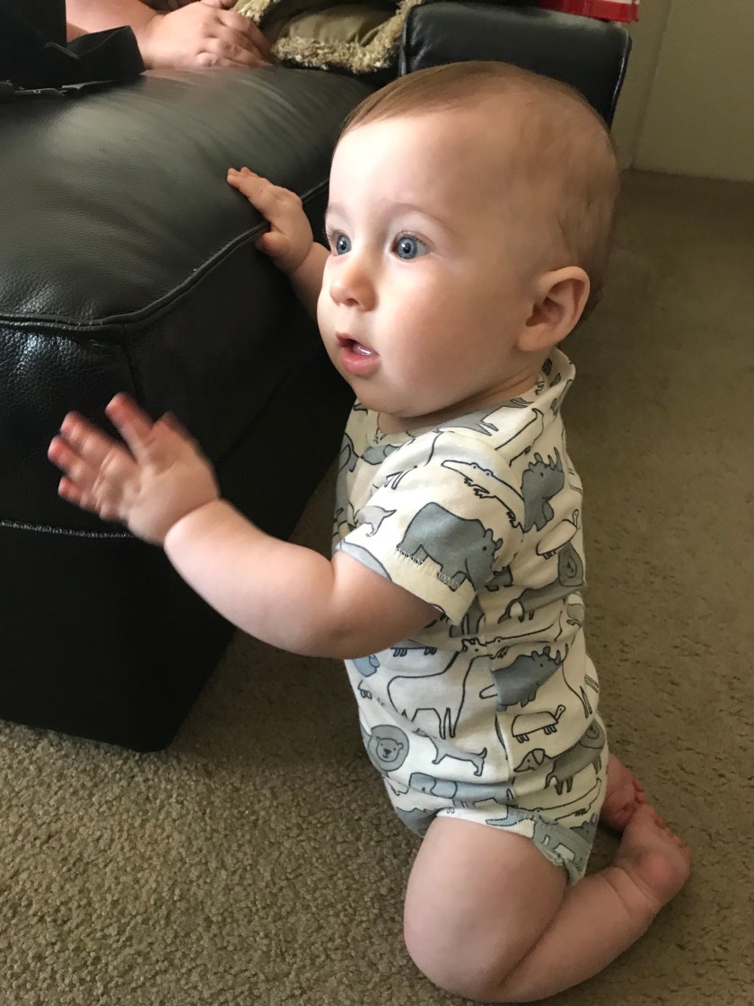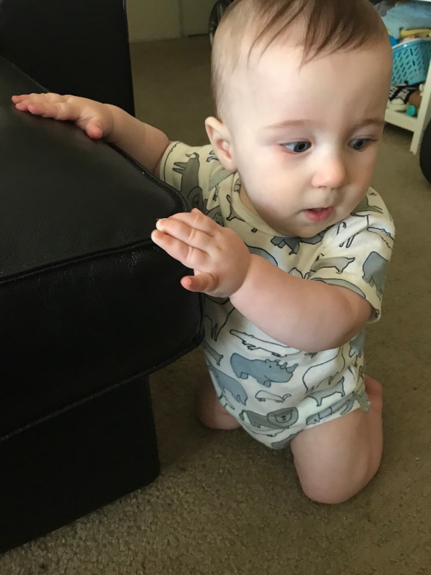 He’s also testing limits when he uses the furniture around our apartment to pull himself up. He loves being more mobile.