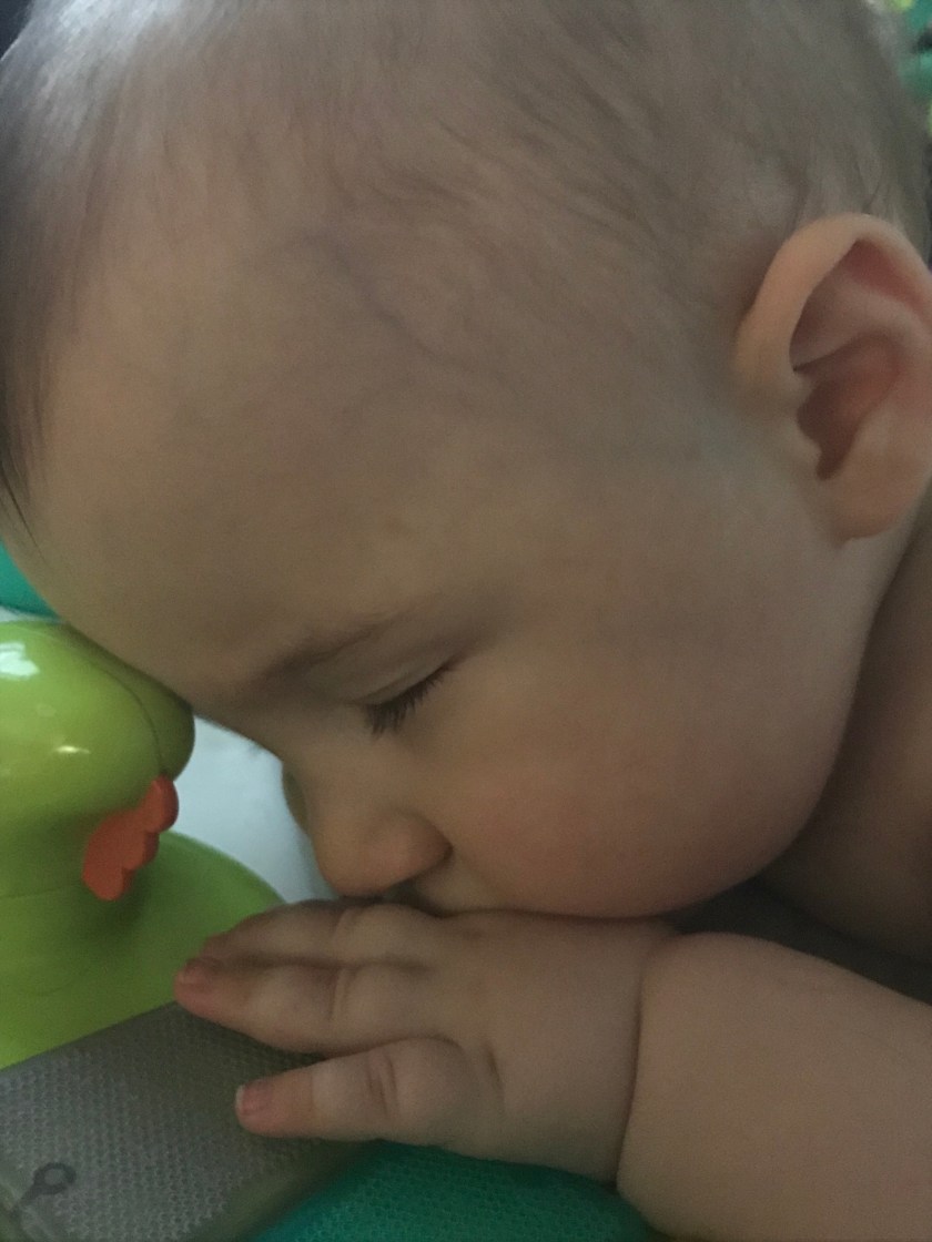 The activity center, in which he sits directly in a chair and is surrounded by toys is another of his favorites. While he is usually very active in it, one day he was so tired he briefly fell asleep on the keyboard.