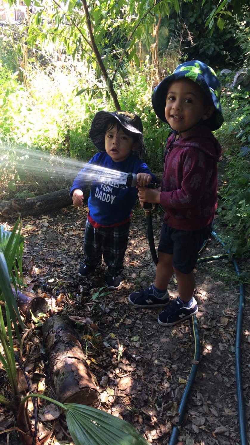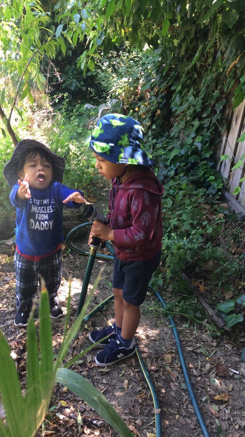 As far as I know children develop skills in part due to the ability of their bodies to do so and in part due to motivation. In William’s case, I think a lot of the motivation comes from attending daycare three days a week and seeing the boys engage in tasks he cannot do at the present time including standing unassisted, walking, running and playing with toys and other things. As it’s been hot lately, one day when William was not there, Mirabel had the other boys have fun with her garden hose and sent Matt and I photos.