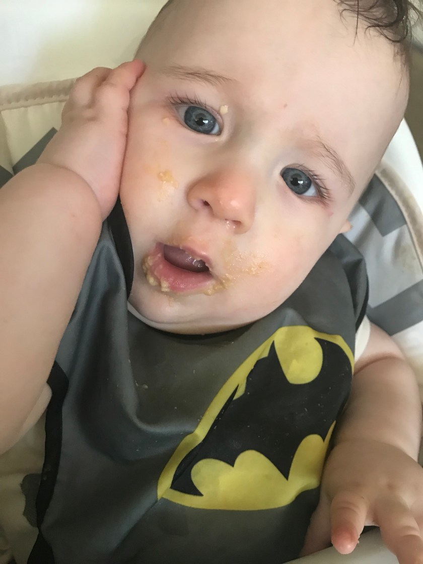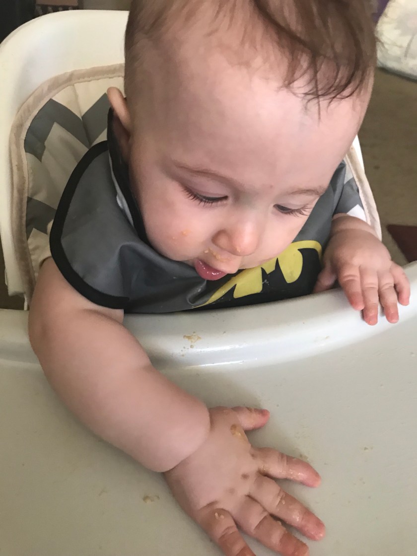 It’s not surprising that we were given so many bibs at my baby shower. Mealtime is definitely one of the most messy parts of William’s day. As he’s learning about food tastes and textures and getting more involved in the process, his food tends to go all over the place. Here he is trying to feed himself directly with the spoon.