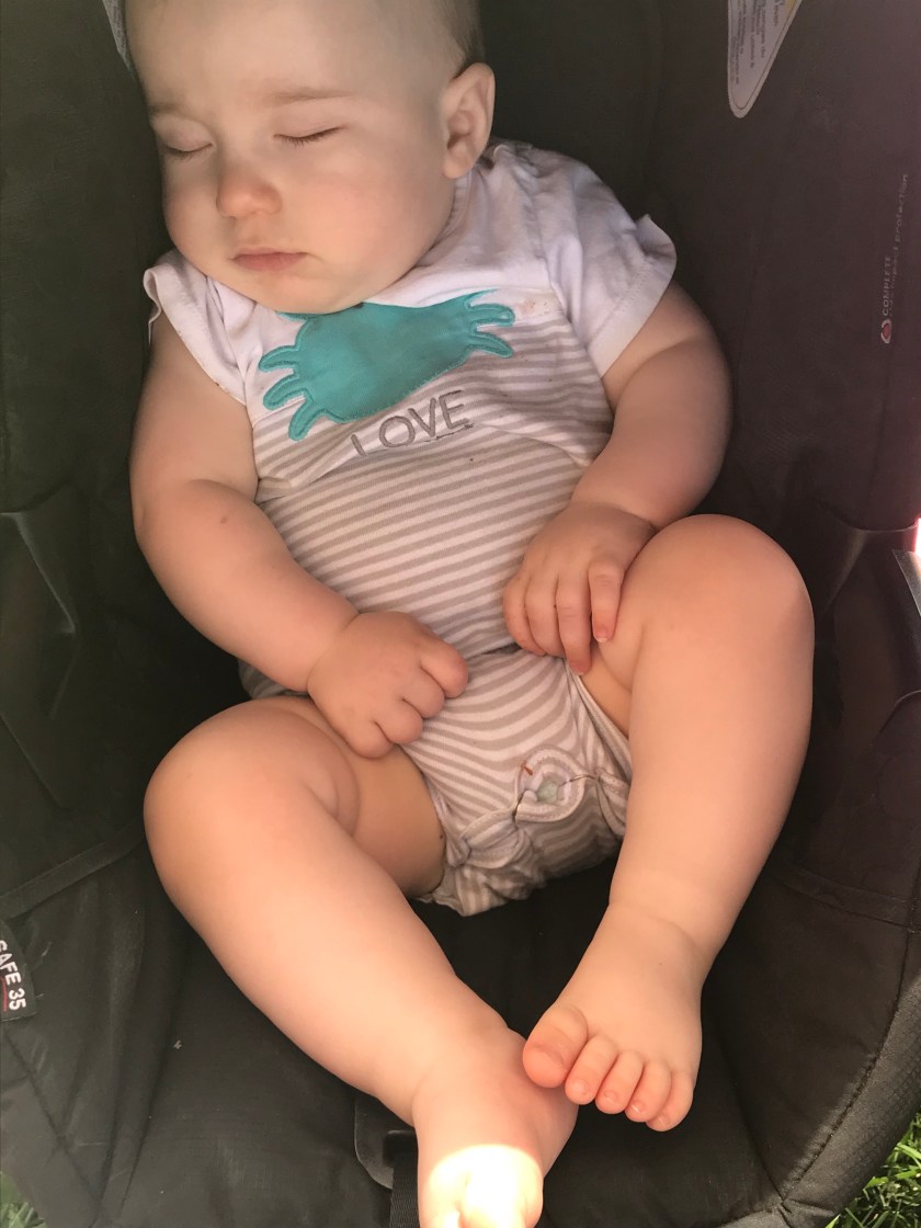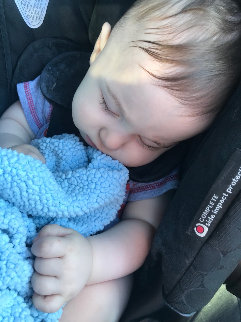 As far as naps, it depends on what the day brings for him. Sometimes he will seem to just know it’s nap time and shows signs of being tired, other times, he’d have to be put into his travel crib and given time to wear himself out a bit, then finally nap. He used to fall asleep easily every car trip, now he won’t as readily, especially if he has entertainment such as Candy talking with him.