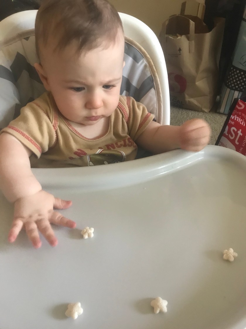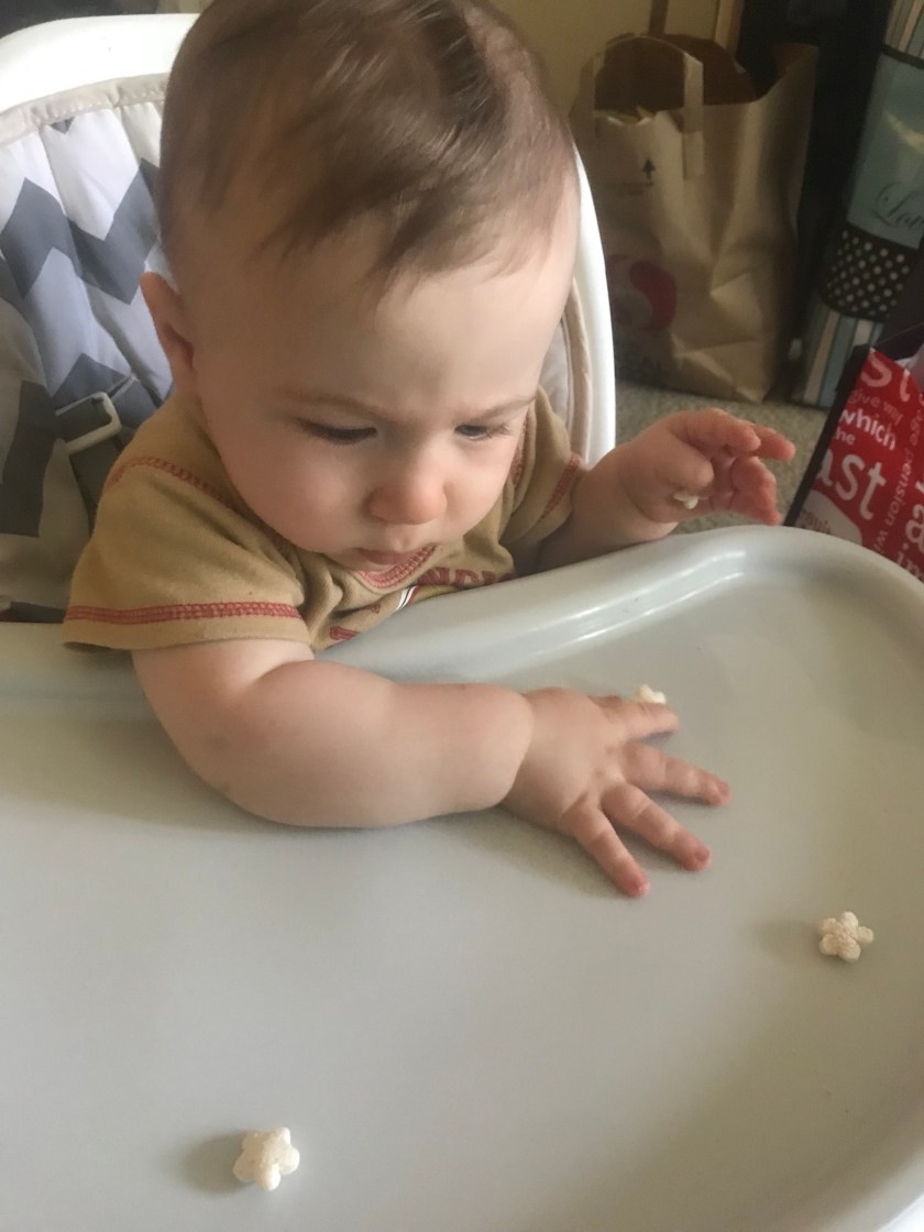 Candy mentioned that William should really be enjoying his Gerber Puff cereal, both in terms of texture and flavor. The few times we’ve given it to him he wasn’t a huge fan, however, I decided to let him have another try with them.