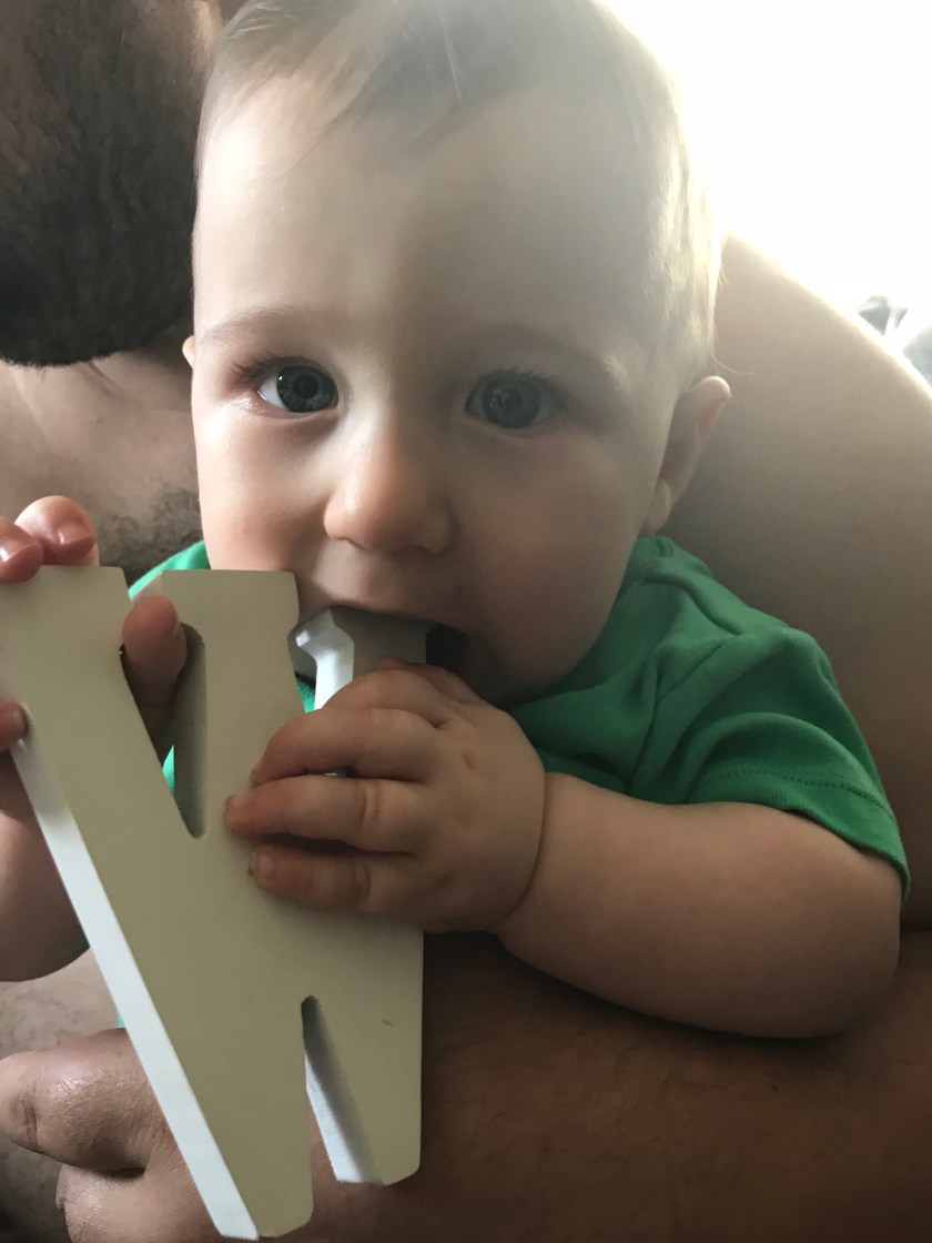I didn’t even have a chance to get him to hold a block. I did however, get him to hold his famous W, which he promptly put in his mouth. I let him keep it there for a just a momet as I snapped this, then I took it away from him.